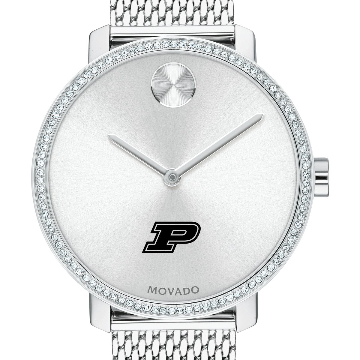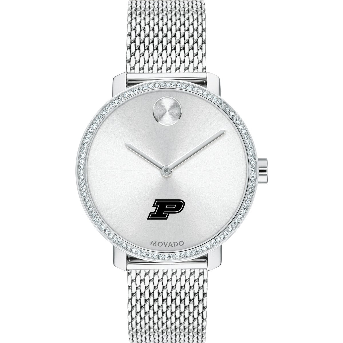 Purdue University Women's Movado BOLD watch features the Purdue University logo in full color at 6 o'clock on silver sunray dial.