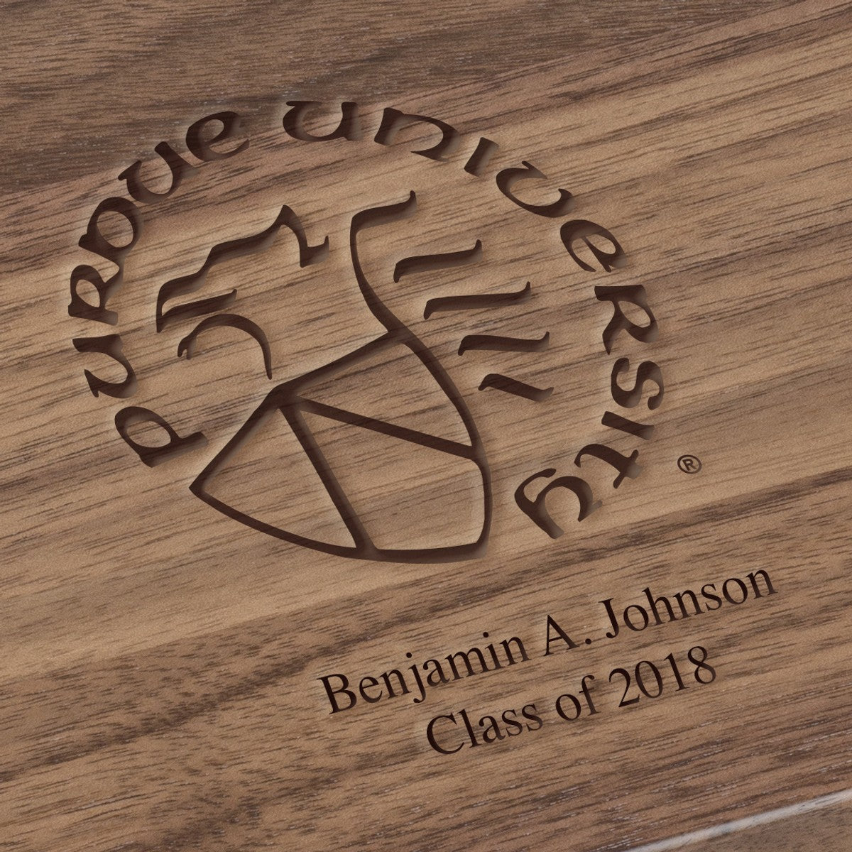 Our beautiful solid walnut desk box is made from hand-selected domestic walnut and crafted in the USA. Each box is hand finished with care, and proudly displays the Purdue University logo on the lid.