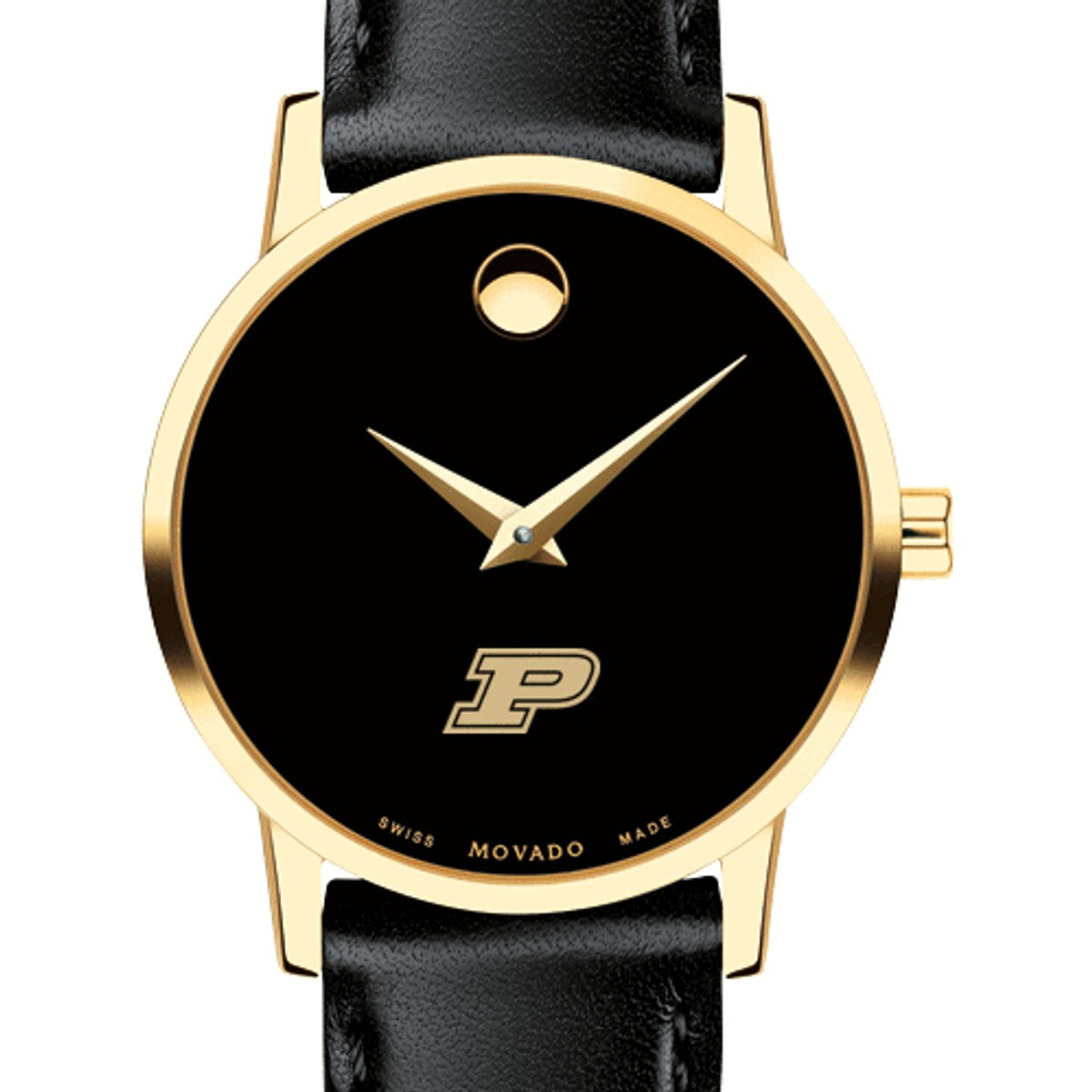 Purdue University Women's Movado Museum watch features the Purdue University logo in full color at 6 o'clock on black dial. Created in 1947, the iconic concave dot symbolizes the sun at high-noon. Complimentary personal engraving.