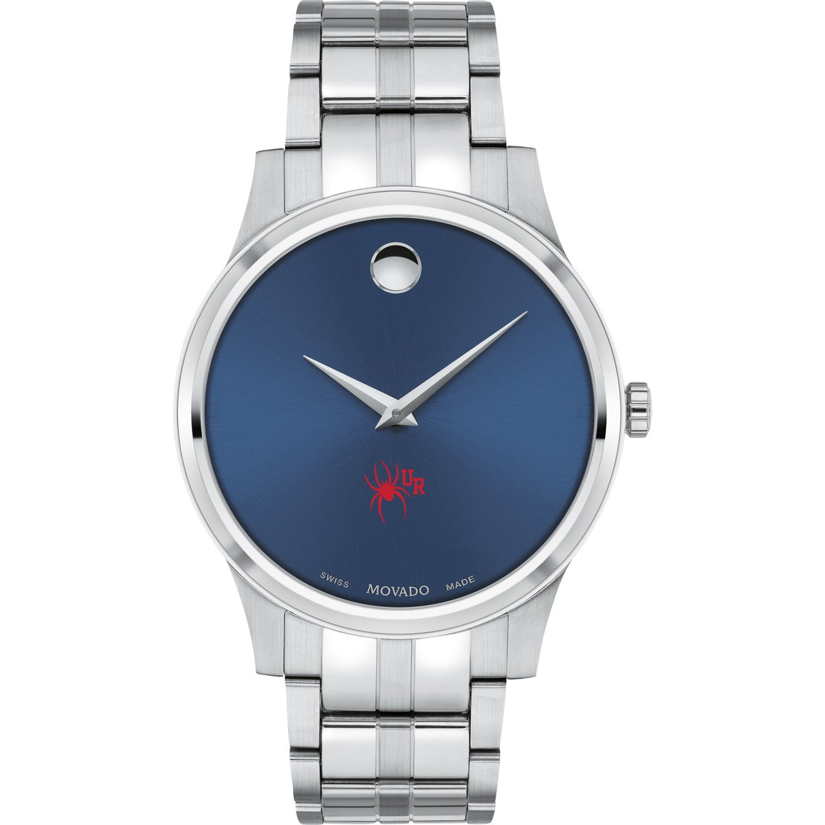 The University of Richmond Men's Movado Collection watch boasts a striking blue dial featuring the iconic Richmond logo in full color. This timeless timepiece, renowned for its concave dot representing the sun at high noon, has been a symbol of elegance since its inception in 1947. Make it uniquely yours with free engraving without affecting order processing time.