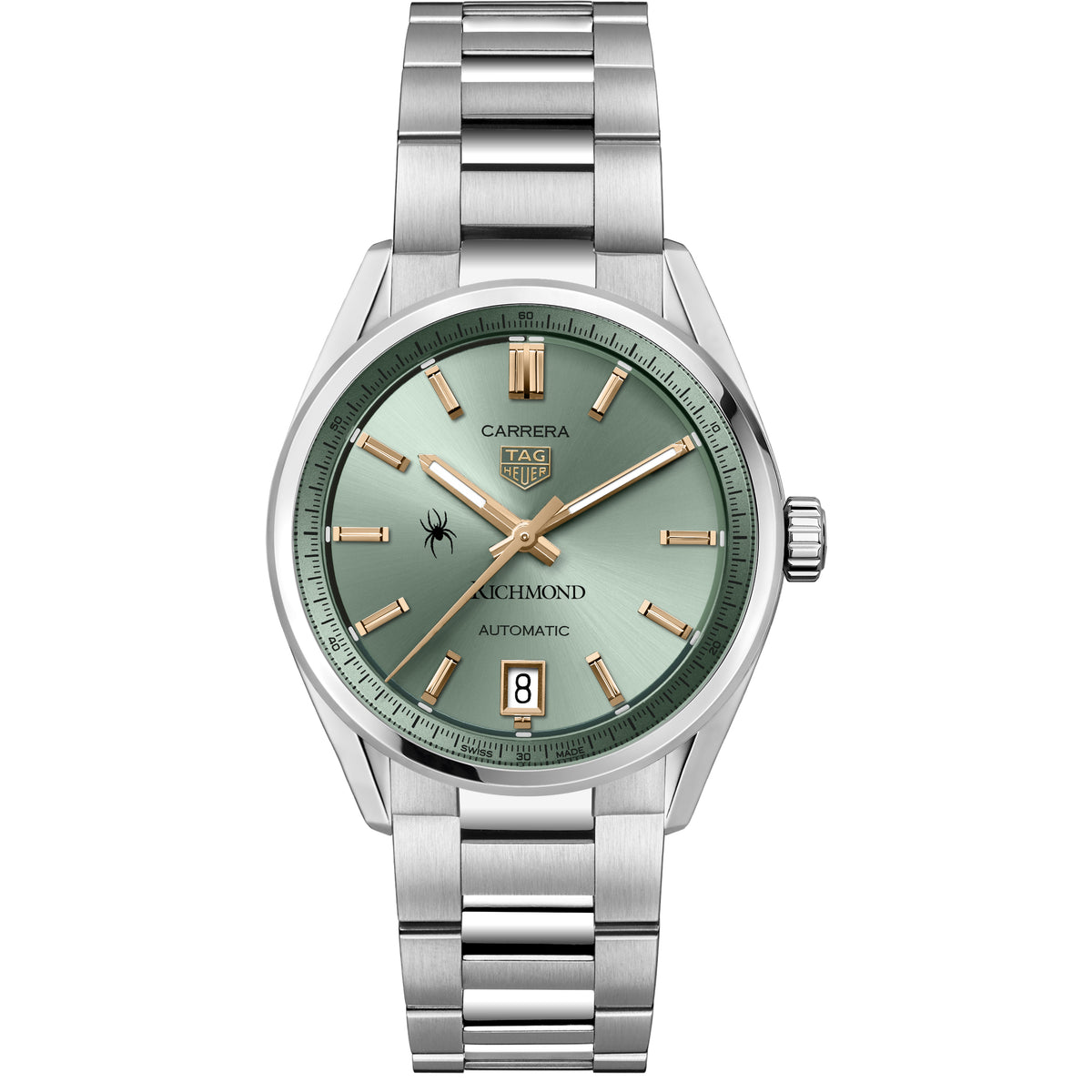 Explore the Richmond Women's TAG Heuer Steel Carrera watch, featuring the Richmond logo on a pastel green sunray brushed dial with 18K 5N rose gold-plated hands and indexes. Equipped with the Calibre 7 movement, it combines style and superior functionality. Complimentary personal engraving.