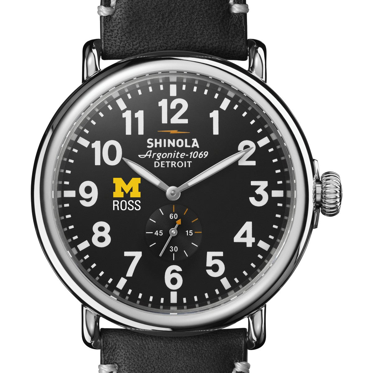 The Shinola Runwell features the Michigan Ross logo in color on the black dial with a large 47 mm case. Every detail of Shinola's flagship timepiece has been engineered with an obsessive focus to ensure it can be worn any way but it can't be worn out. Complimentary personal engraving