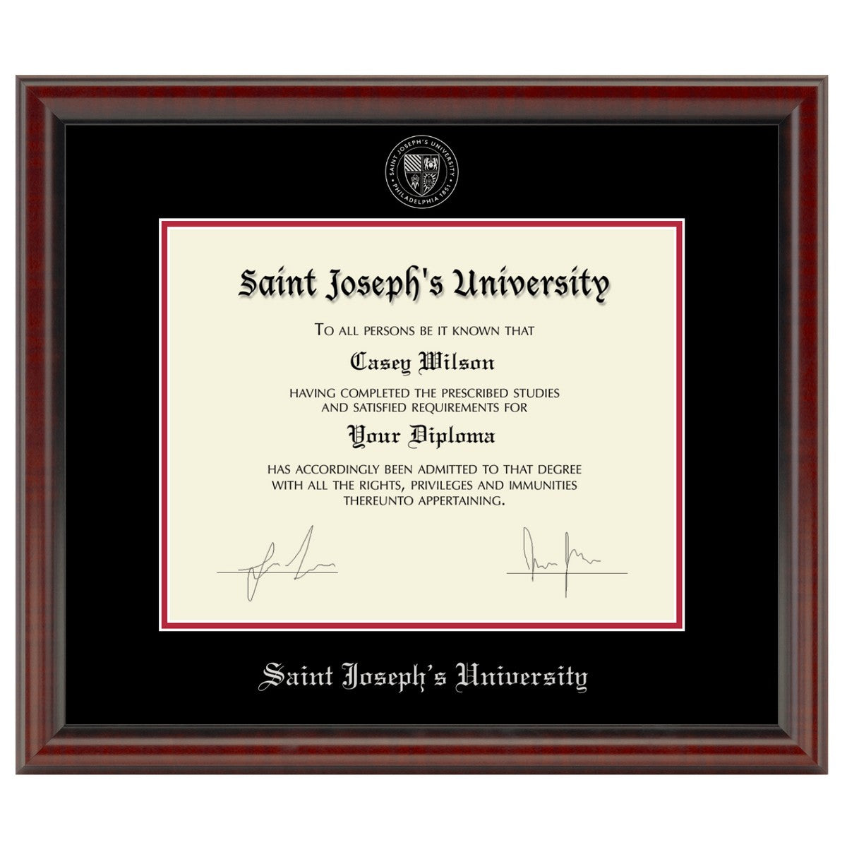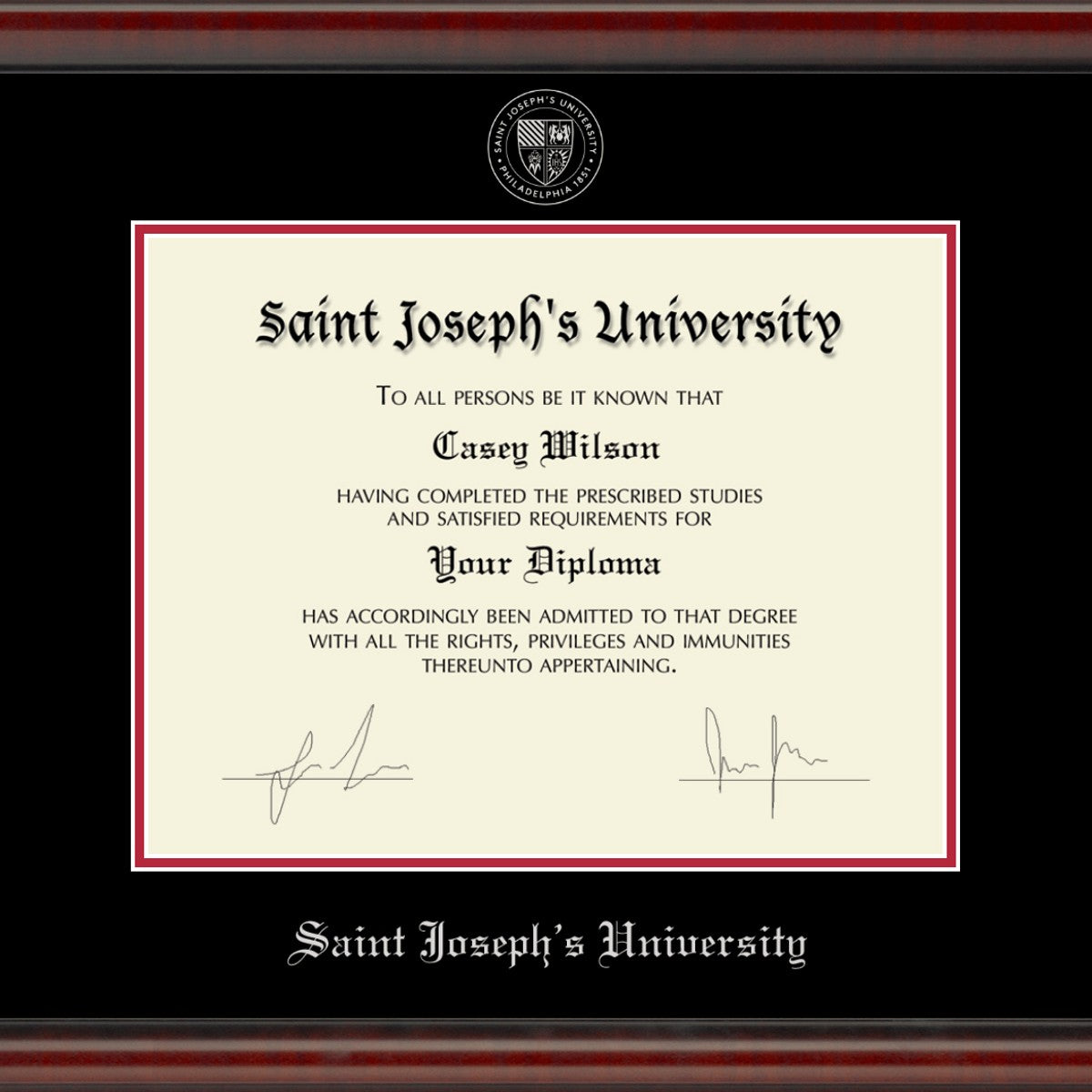 This Saint Joseph's University diploma frame is crafted from solid wood in the USA. Proudly display your Saint Joseph's diploma with museum quality conservation mounting materials to showcase and protect your Saint Joseph's University diploma.