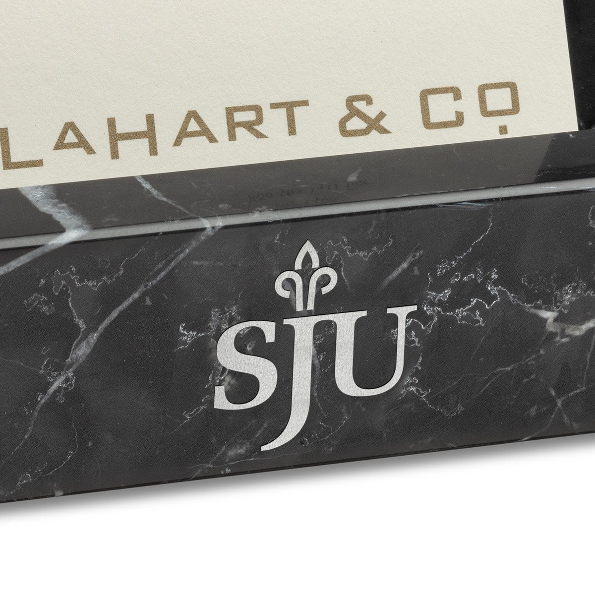 Perfect for new grads and seasoned professionals, the officially licensed Saint Joseph's University marble cardholder is an essential for the desk of Saint Joseph's fans. The Saint Joseph's University Logo is elegantly featured on the front of this substantial, solid marble card holder and accommodates all standard size business cards.