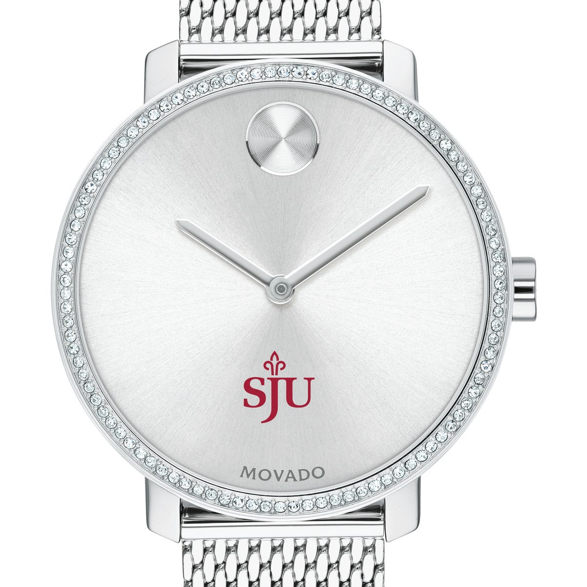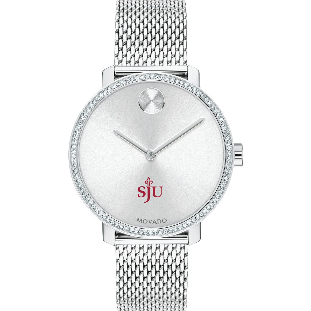 Saint Joseph's University Women's Movado BOLD watch features the Saint Joseph's University Logo in full color at 6 o'clock on silver sunray dial.