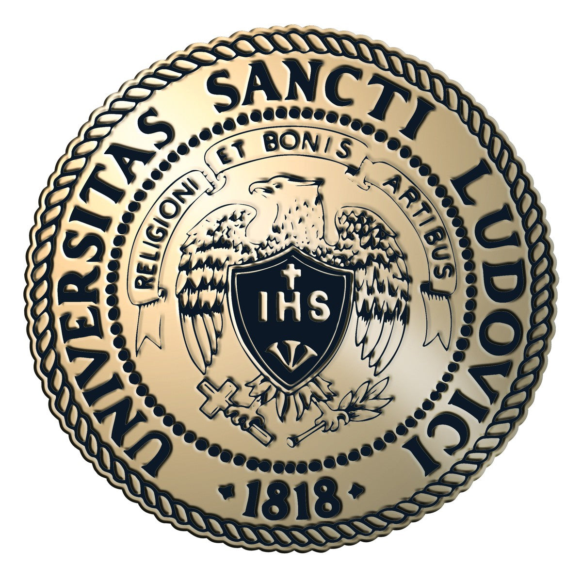 - Custom minted Saint Louis University seal with hand painted enamel accents; inset into bevel-cut opening
