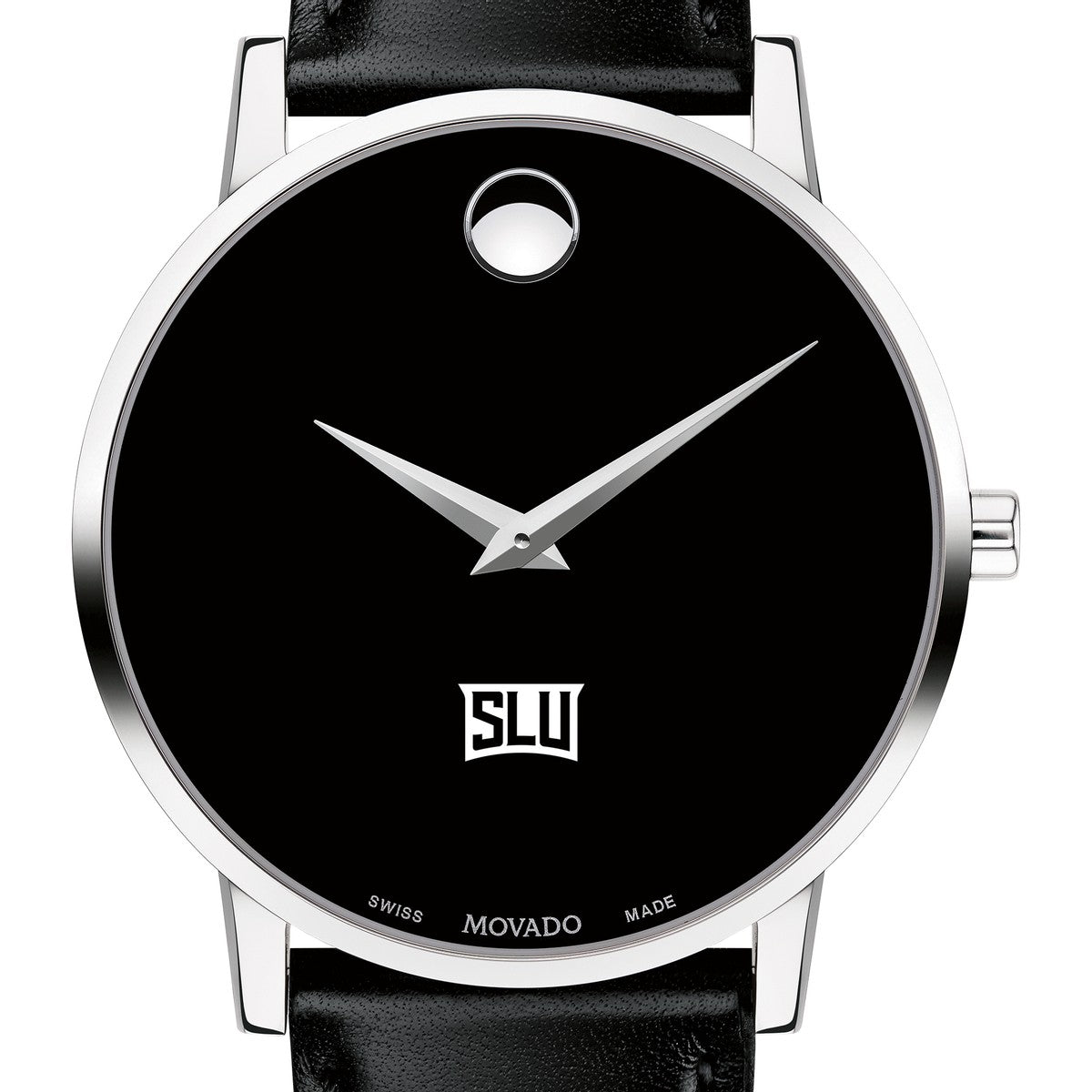 Saint Louis University Men's Movado Museum watch features the SLU logo in full color at 6 o'clock on black dial. Created in 1947, the iconic concave dot symbolizes the sun at high-noon. Complimentary personal engraving.