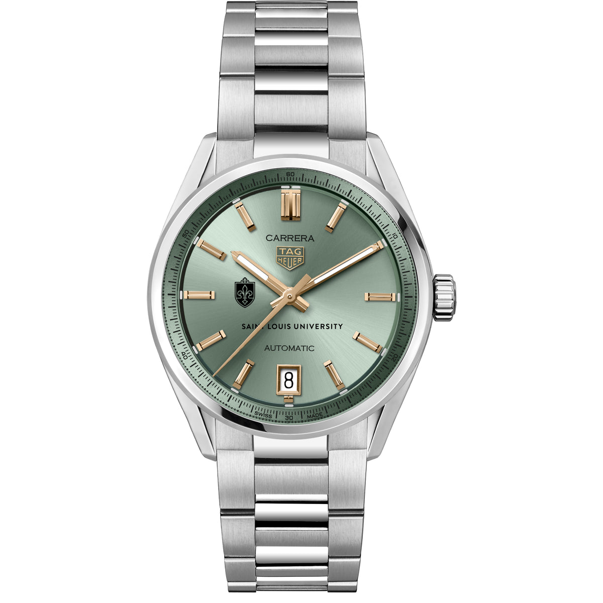 Explore the SLU Women's TAG Heuer Steel Carrera watch, featuring the SLU logo on a pastel green sunray brushed dial with 18K 5N rose gold-plated hands and indexes. Equipped with the Calibre 7 movement, it combines style and superior functionality. Complimentary personal engraving.