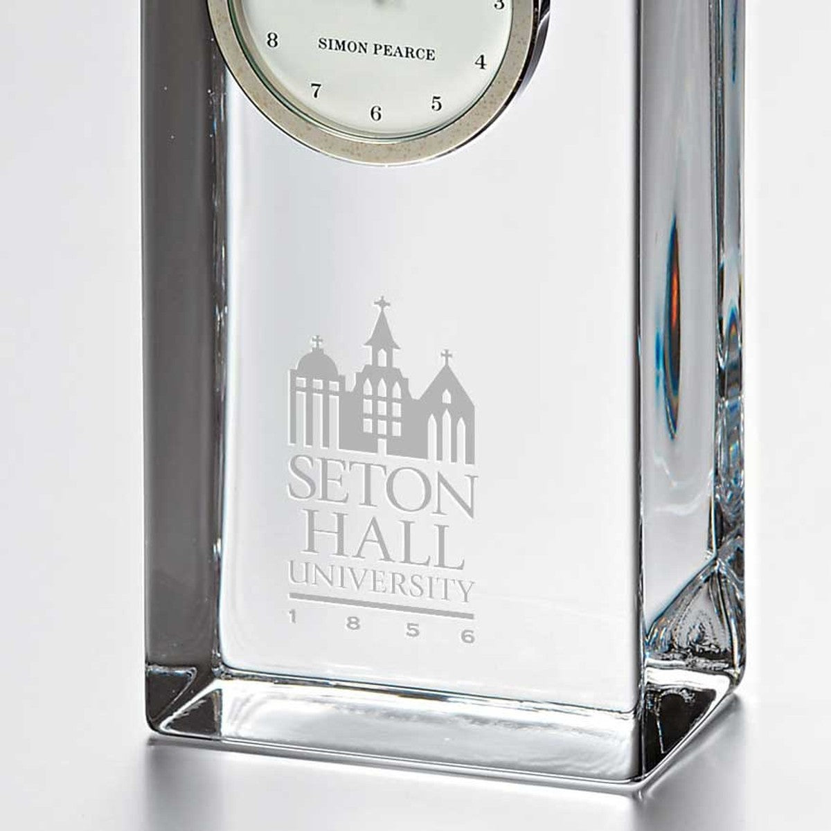 The Seton Hall Tall Glass Desk Clock stands proudly on any surface, distinctly etched with the Seton Hall Logo. The clock showcases a traditional numbered face with a sweep hand to count the seconds.