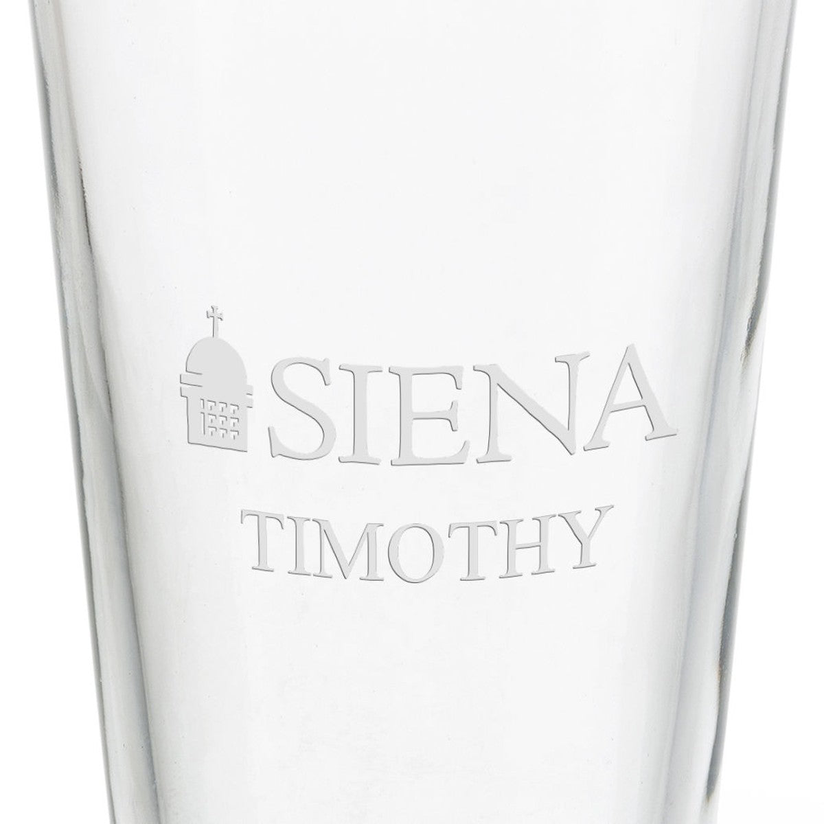 Each Siena 16 oz pint glass is deep-etched with the Siena College logo. Its simple styling and crystal-clear clarity make this glass perfect for any drink. Your name can be added under the logo for free.