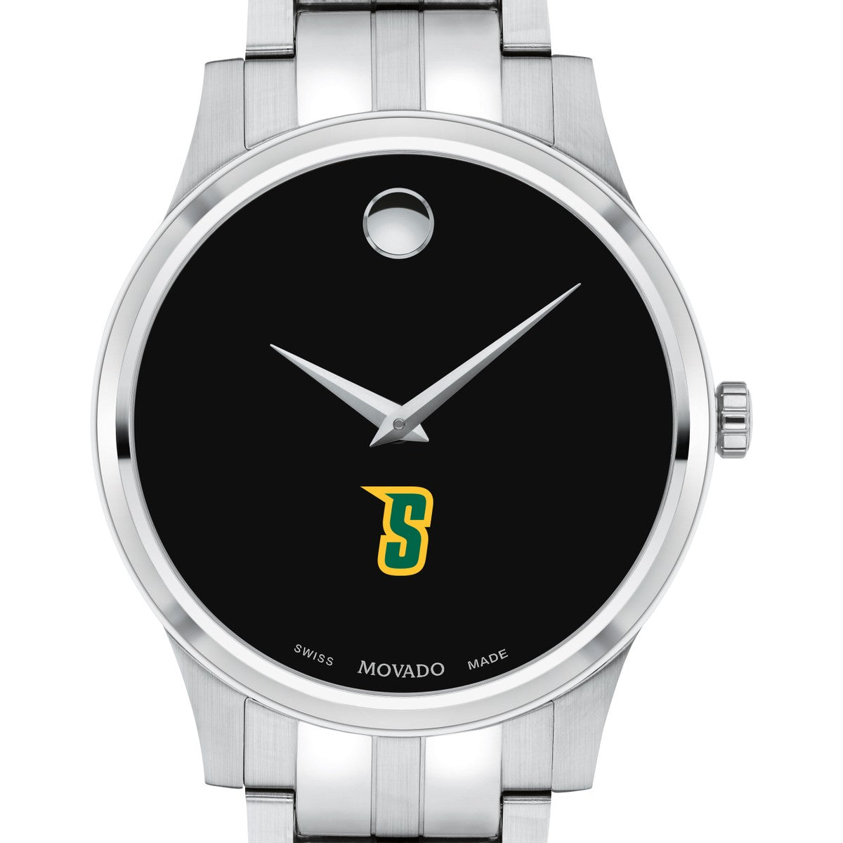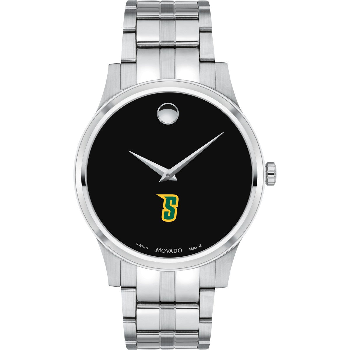 The Siena College Men's Movado Collection watch showcases the iconic Siena Logo in full color on a sophisticated black dial. This classic timepiece, featuring the renowned concave dot symbolizing the sun at high noon, has been a design masterpiece since its creation in 1947. Personalize your watch with free engraving without any delay to your order.