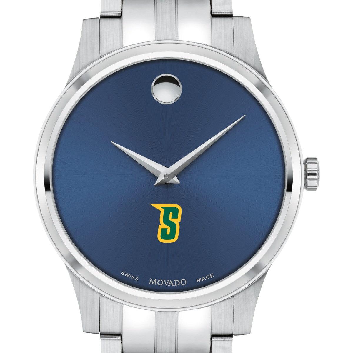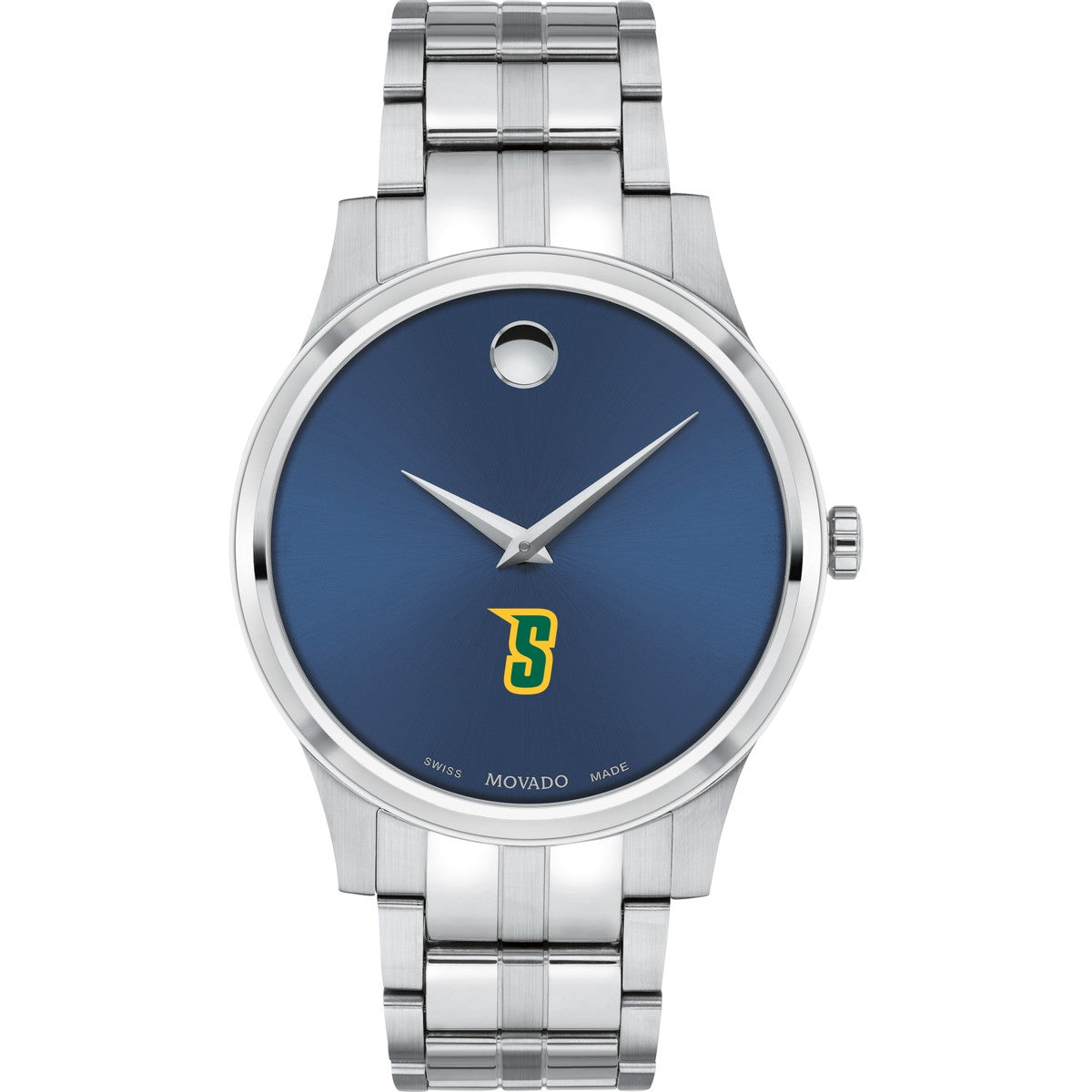 The Siena College Men's Movado Collection watch boasts a striking blue dial featuring the iconic Siena Logo in full color. This timeless timepiece, renowned for its concave dot representing the sun at high noon, has been a symbol of elegance since its inception in 1947. Make it uniquely yours with free engraving without affecting order processing time.