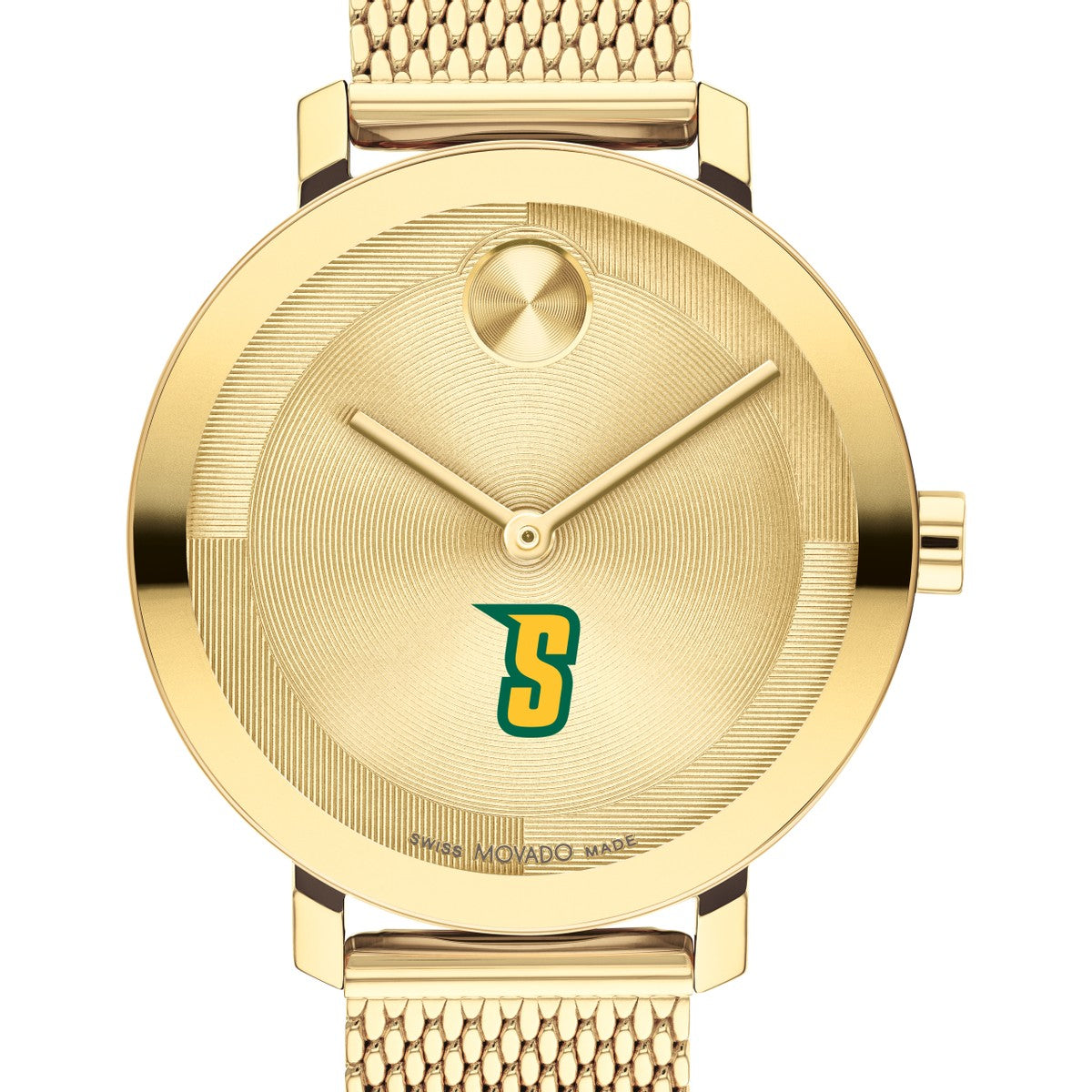 The Siena College Women's BOLD Movado features the prestigious Siena Logo. Its pale gold Ionic-plated stainless steel mesh bracelet exudes contemporary elegance, making it a timeless accessory for the modern woman.