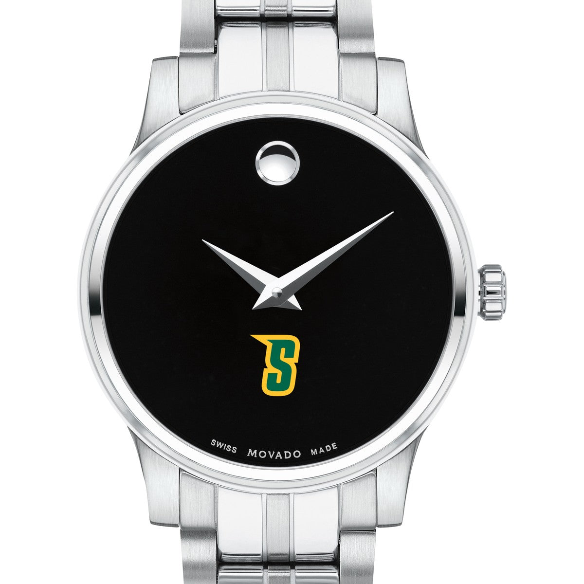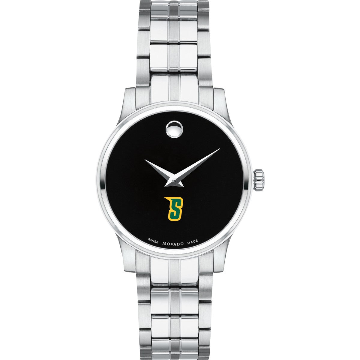 The Siena College Women's Movado Collection watch showcases the iconic Siena Logo in full color against a sophisticated black dial. This elegant timepiece, featuring the renowned concave dot symbolizing the sun at high noon, embodies timeless style. Personalize your watch with free engraving without any delay to your order.