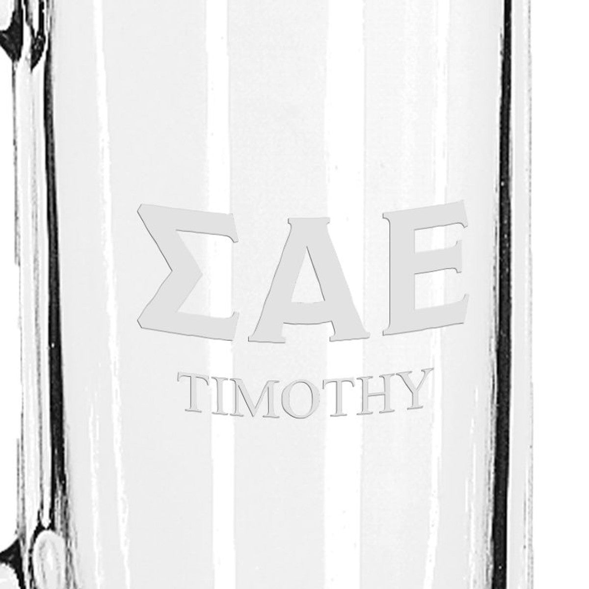 Fans can raise a glass to the with these glasses. The Sigma Alpha Epsilon Logo is deep-etched, and your name can be added under the logo for free.