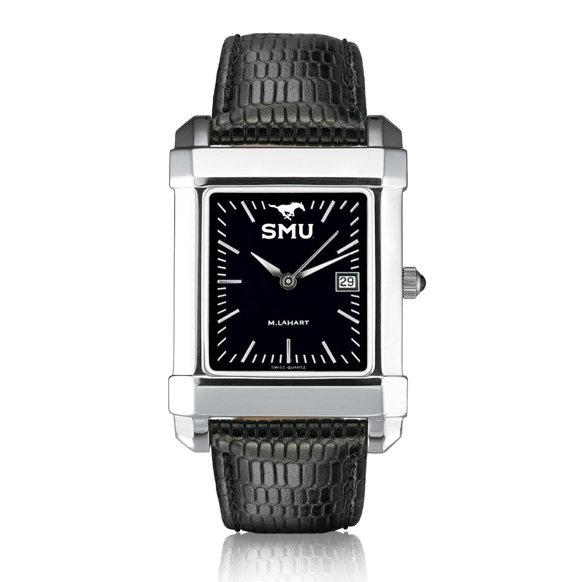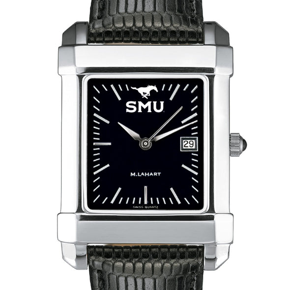 Southern Methodist University men's steel watch with leather strap featuring the SMU Logo on black dial.