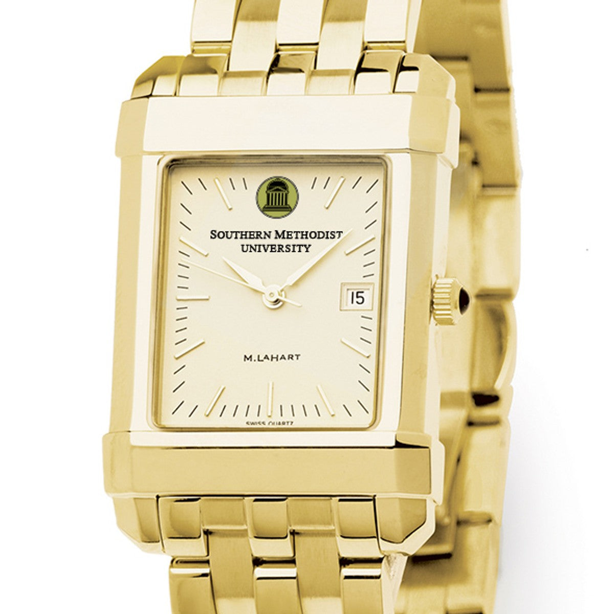 Southern Methodist University men's gold watch featuring the SMU Logo on cream dial. Free Engraving on all watches.