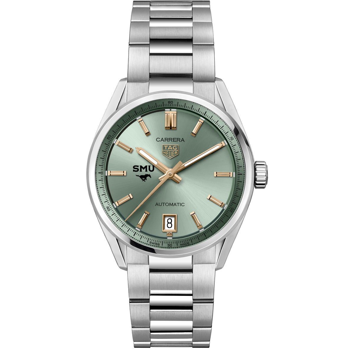 Explore the SMU Women's TAG Heuer Steel Carrera watch, featuring the SMU Logo on a pastel green sunray brushed dial with 18K 5N rose gold-plated hands and indexes. Equipped with the Calibre 7 movement, it combines style and superior functionality. Complimentary personal engraving.