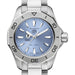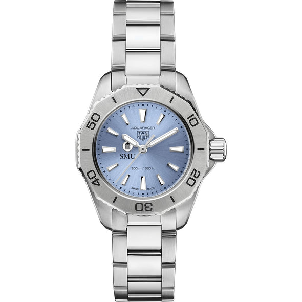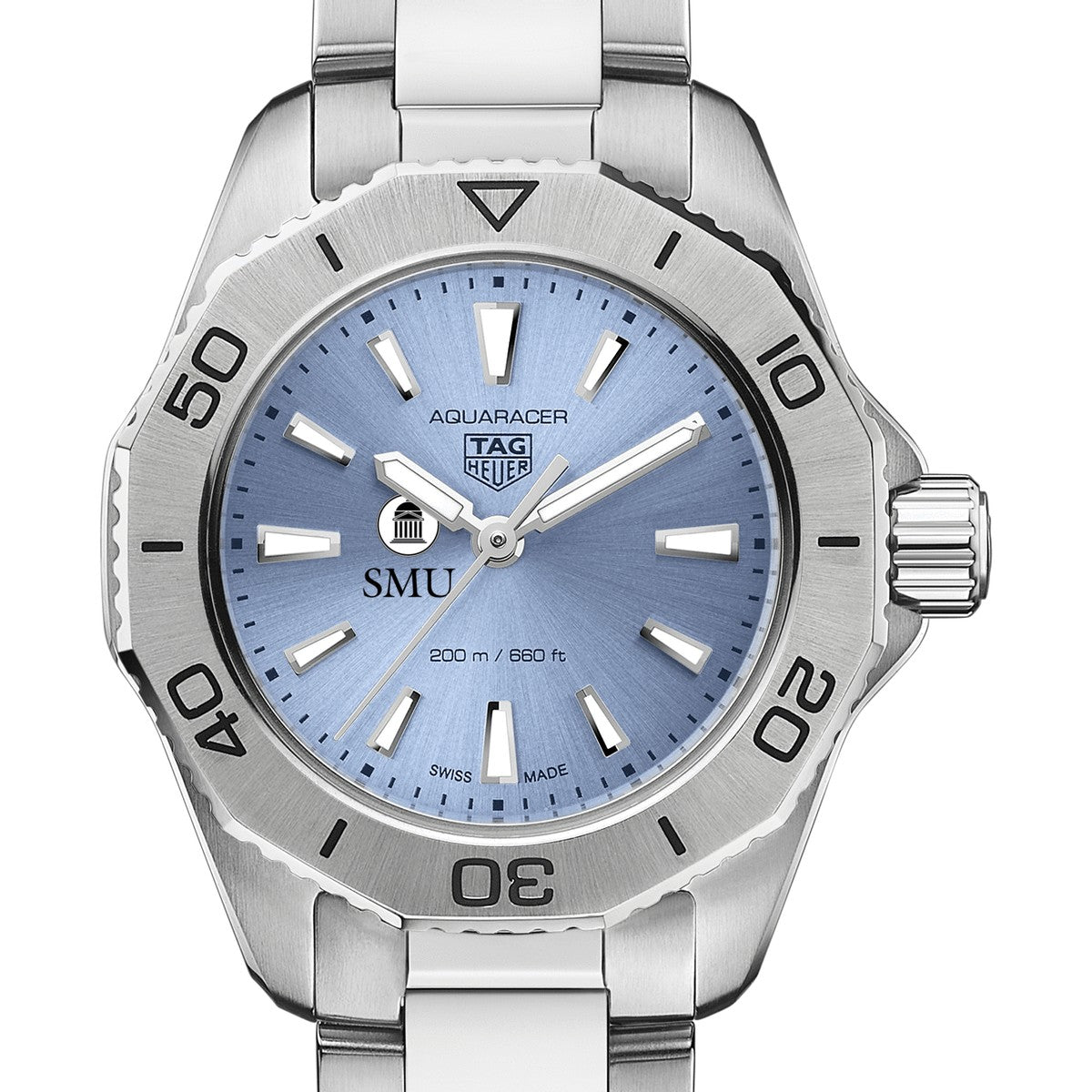 The Southern Methodist University Women's TAG Heuer Steel Aquaracer with Blue Sunray Dial features the SMU Logo on a stunning light blue sunray brushed dial. Complimentary personal engraving.
