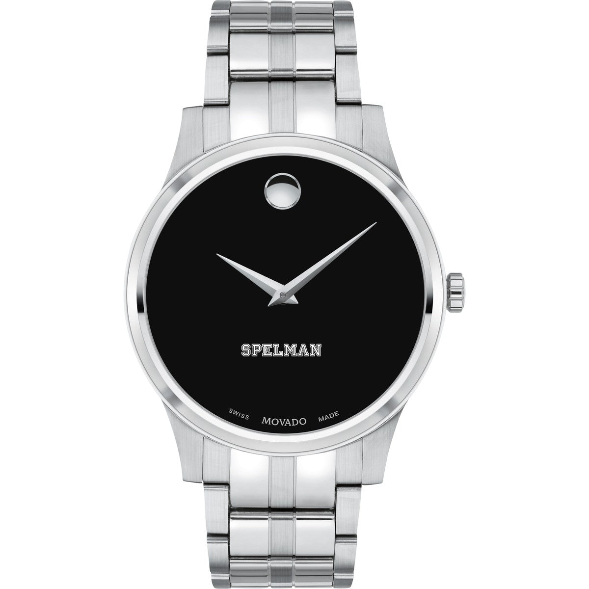 The Spelman College Men's Movado Collection watch showcases the iconic Spelman College Logo in full color on a sophisticated black dial. This classic timepiece, featuring the renowned concave dot symbolizing the sun at high noon, has been a design masterpiece since its creation in 1947. Personalize your watch with free engraving without any delay to your order.
