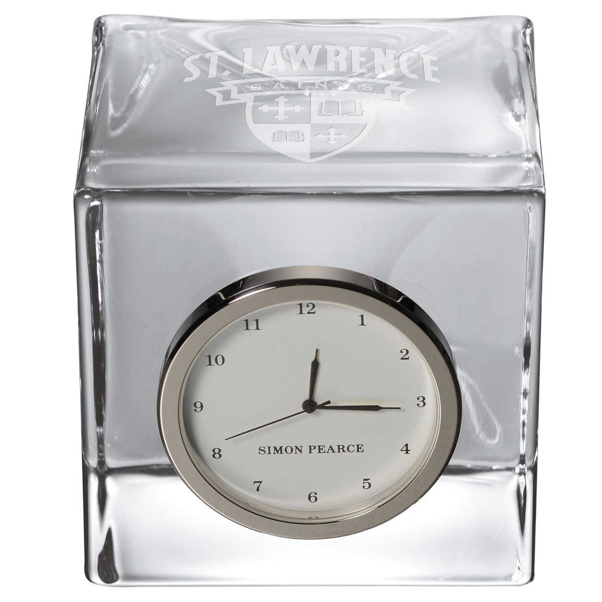 The St. Lawrence University Glass Desk Clock is distinctly etched with the St. Lawrence Logo, and is a great addition to any surface. The clock includes a traditional numbered face with a sweep hand to count the seconds.