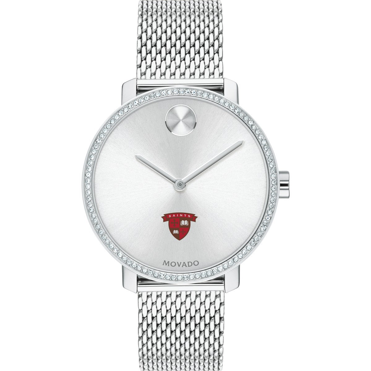 St. Lawrence University Women's Movado BOLD watch features the St. Lawrence Logo in full color at 6 o'clock on silver sunray dial.