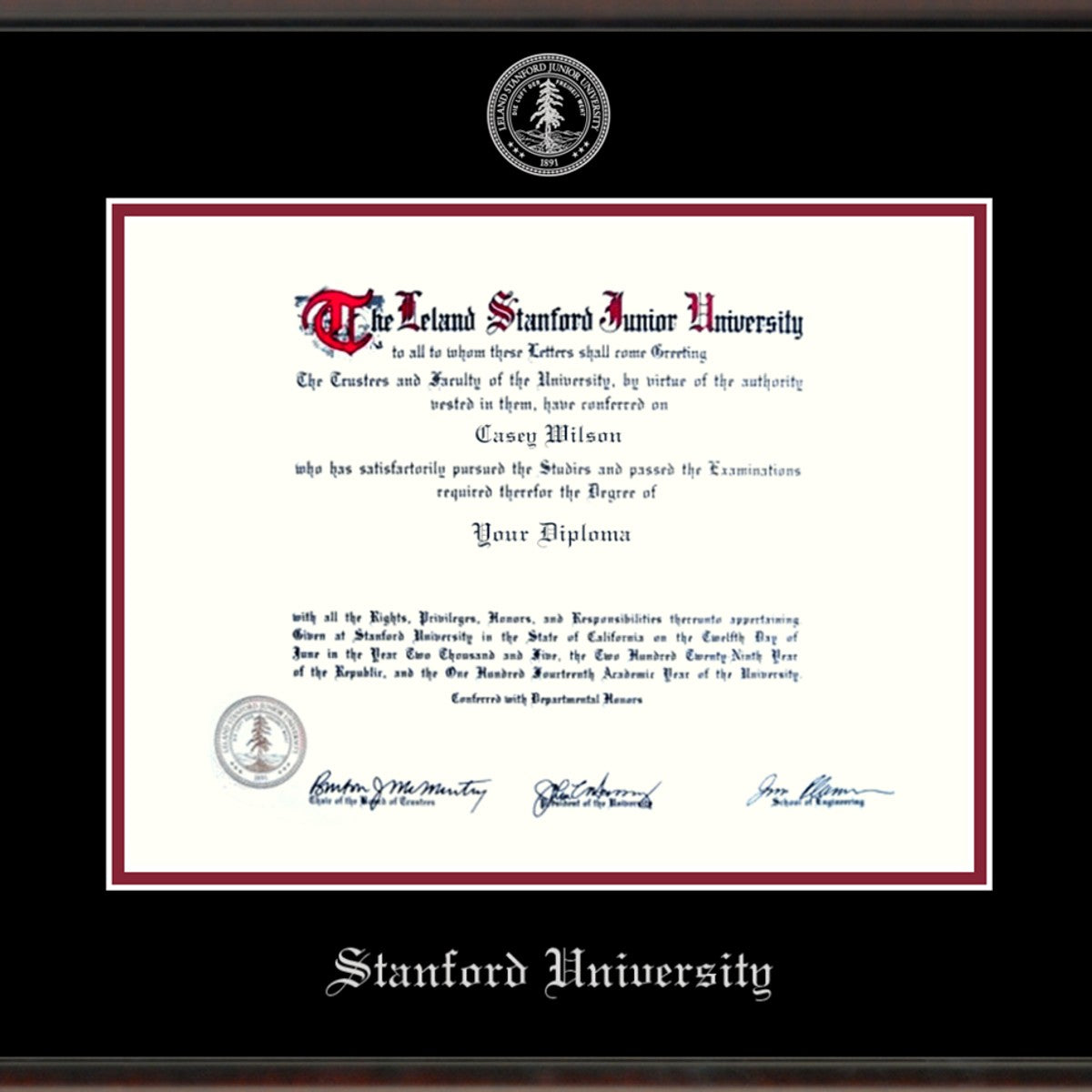 This Stanford University diploma frame is crafted from solid wood in the USA. Proudly display your Stanford diploma with museum quality conservation mounting materials to showcase and protect your Stanford University diploma.