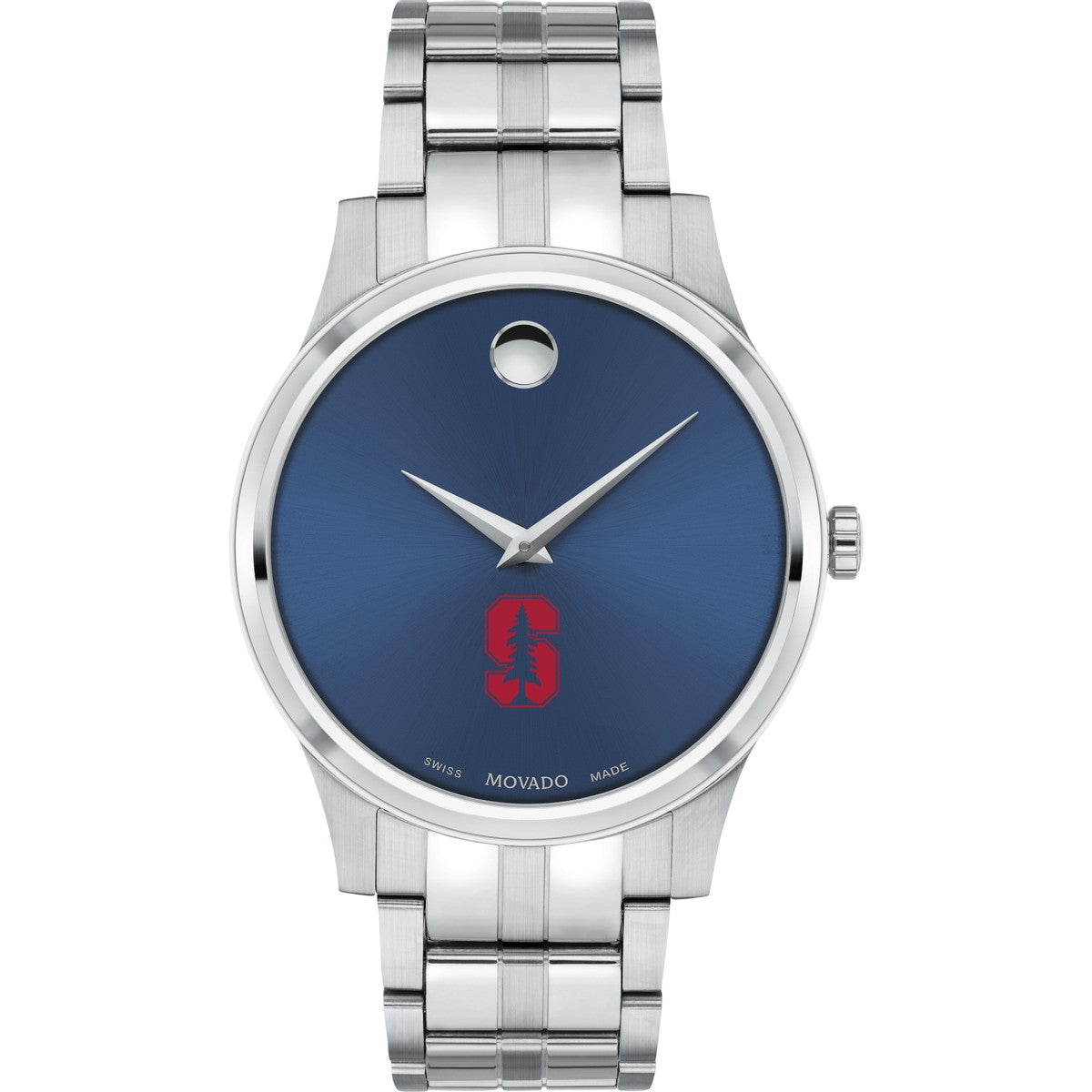The Stanford University Men's Movado Collection watch boasts a striking blue dial featuring the iconic Stanford Logo in full color. This timeless timepiece, renowned for its concave dot representing the sun at high noon, has been a symbol of elegance since its inception in 1947. Make it uniquely yours with free engraving without affecting order processing time.