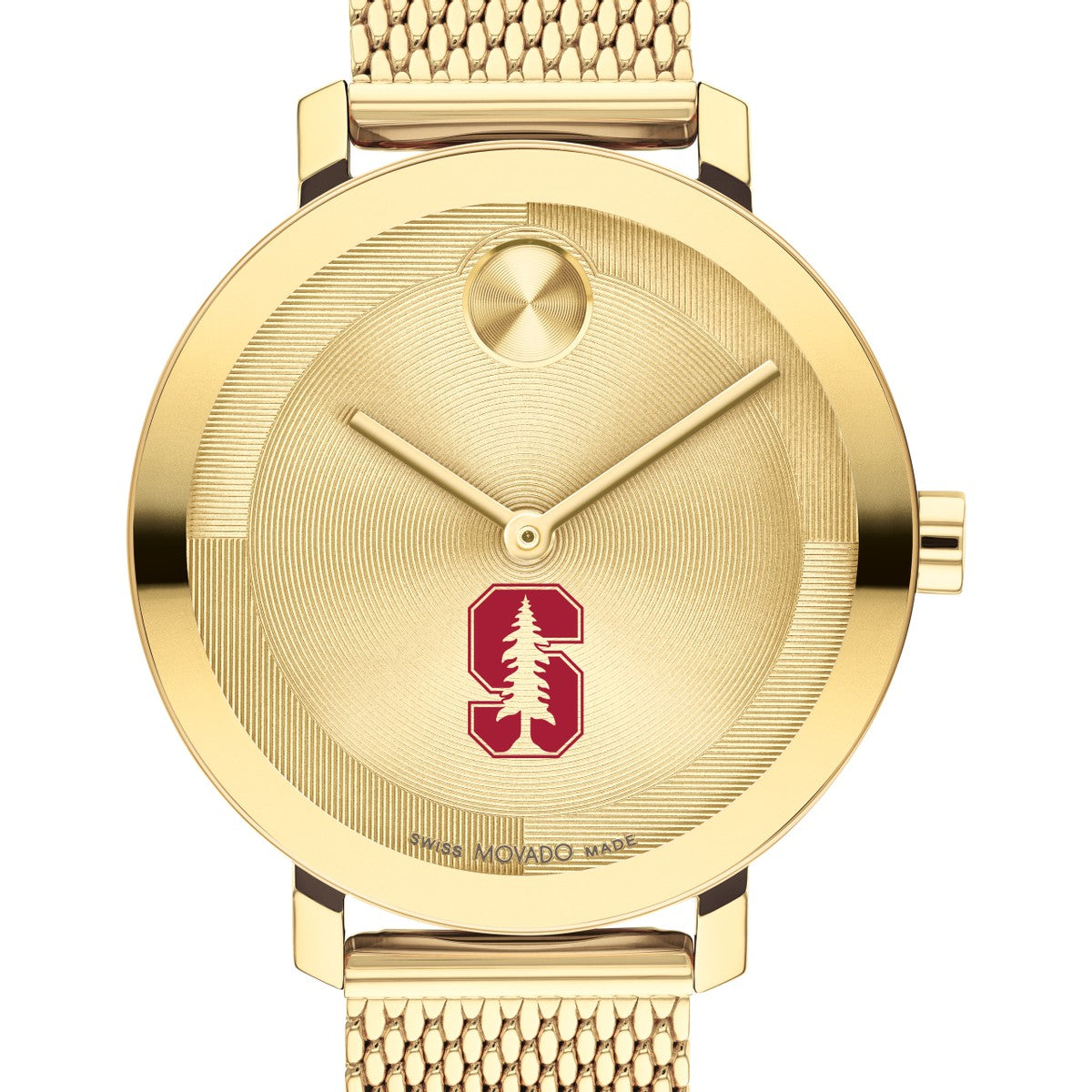 The Stanford University Women's BOLD Movado features the prestigious Stanford Logo. Its pale gold Ionic-plated stainless steel mesh bracelet exudes contemporary elegance, making it a timeless accessory for the modern woman.