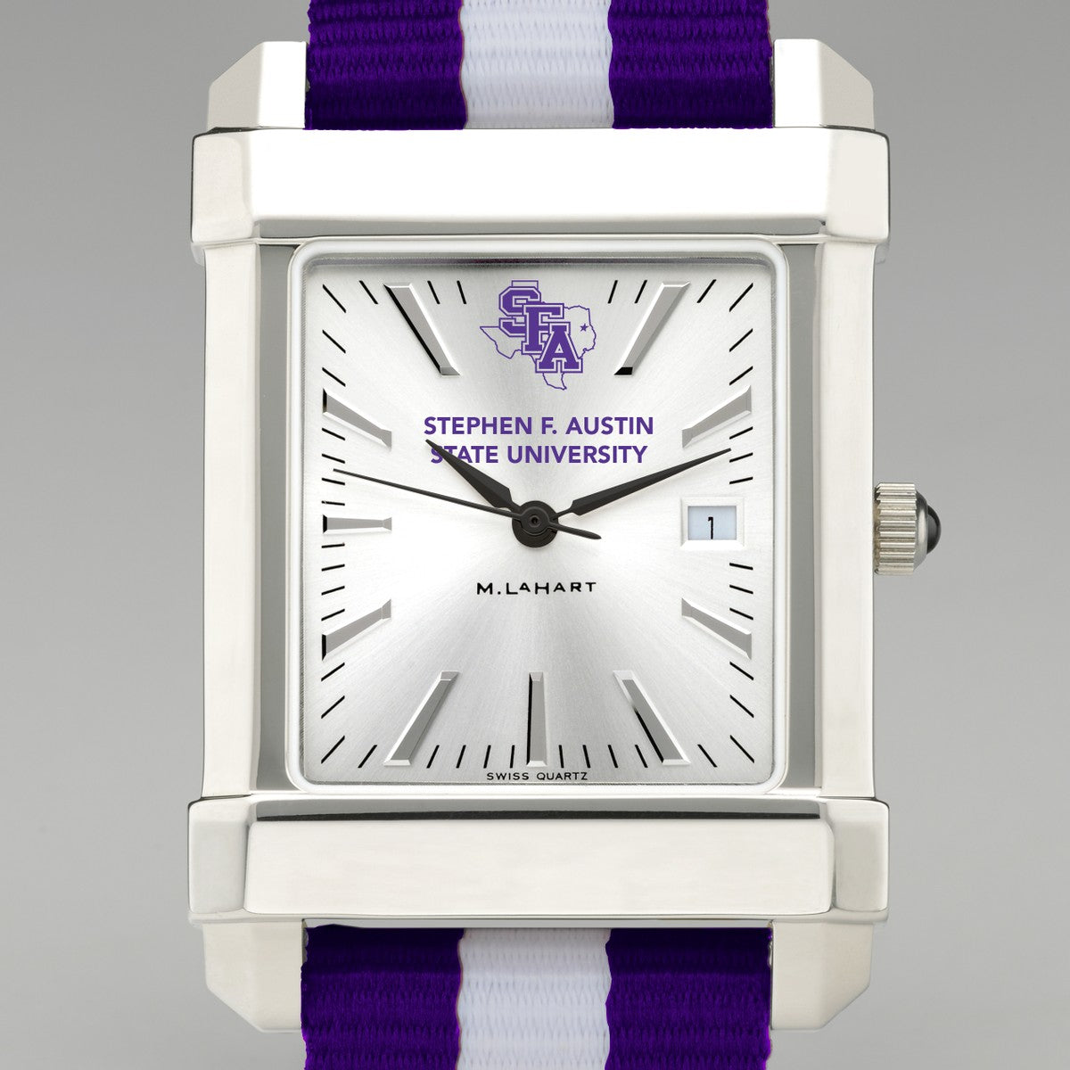 This Stephen F. Austin State University original features the SFASU logo on our sophisticated new dial with a sunray brushed metallic finish. The RAF Nylon strap popularized by James Bond now features your school colors for the first time. Free personalization available on the back of the watch with initials and graduation year.