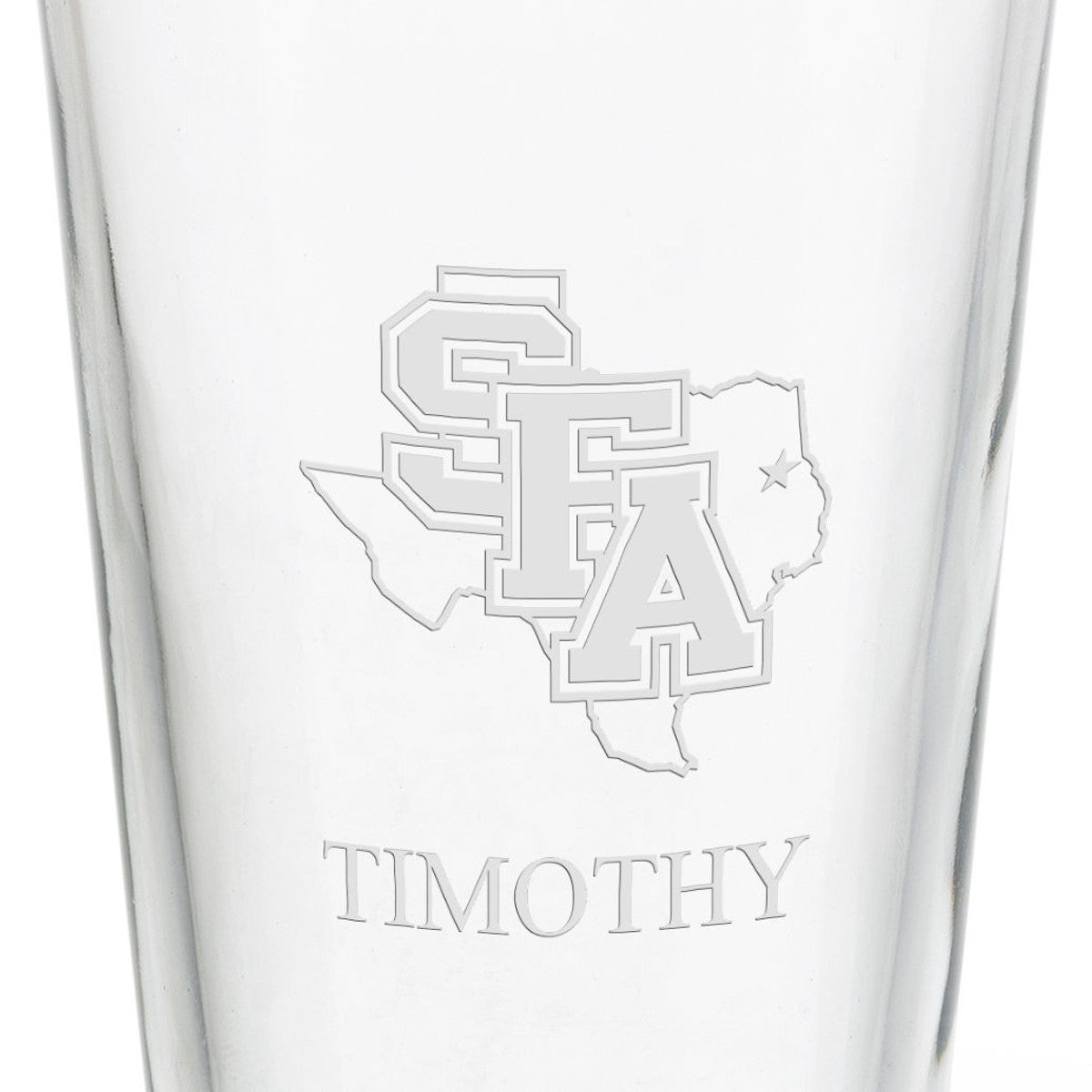 Each SFASU 16 oz pint glass is deep-etched with the Stephen F. Austin State University logo. Its simple styling and crystal-clear clarity make this glass perfect for any drink. Your name can be added under the logo for free.