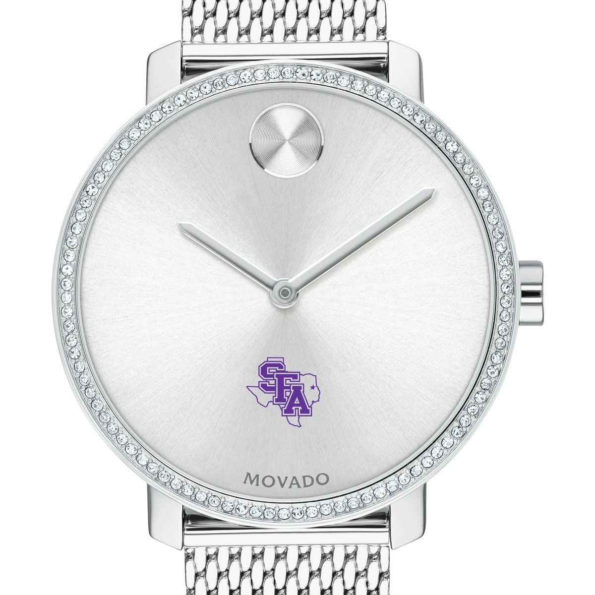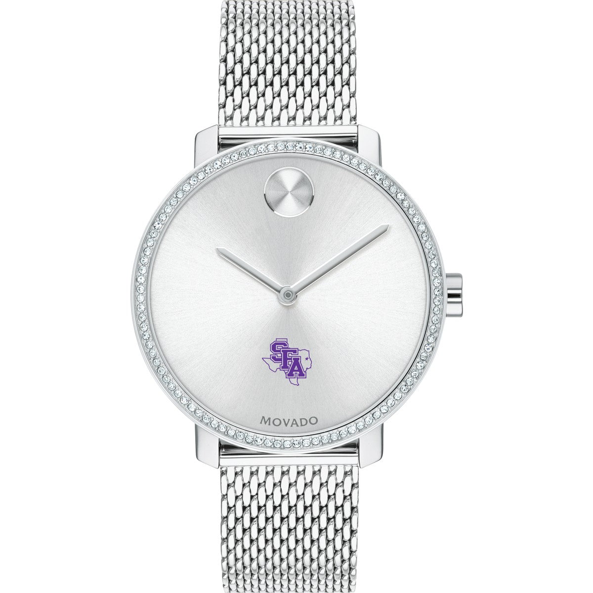 Stephen F. Austin State University Women's Movado BOLD watch features the SFASU logo in full color at 6 o'clock on silver sunray dial.