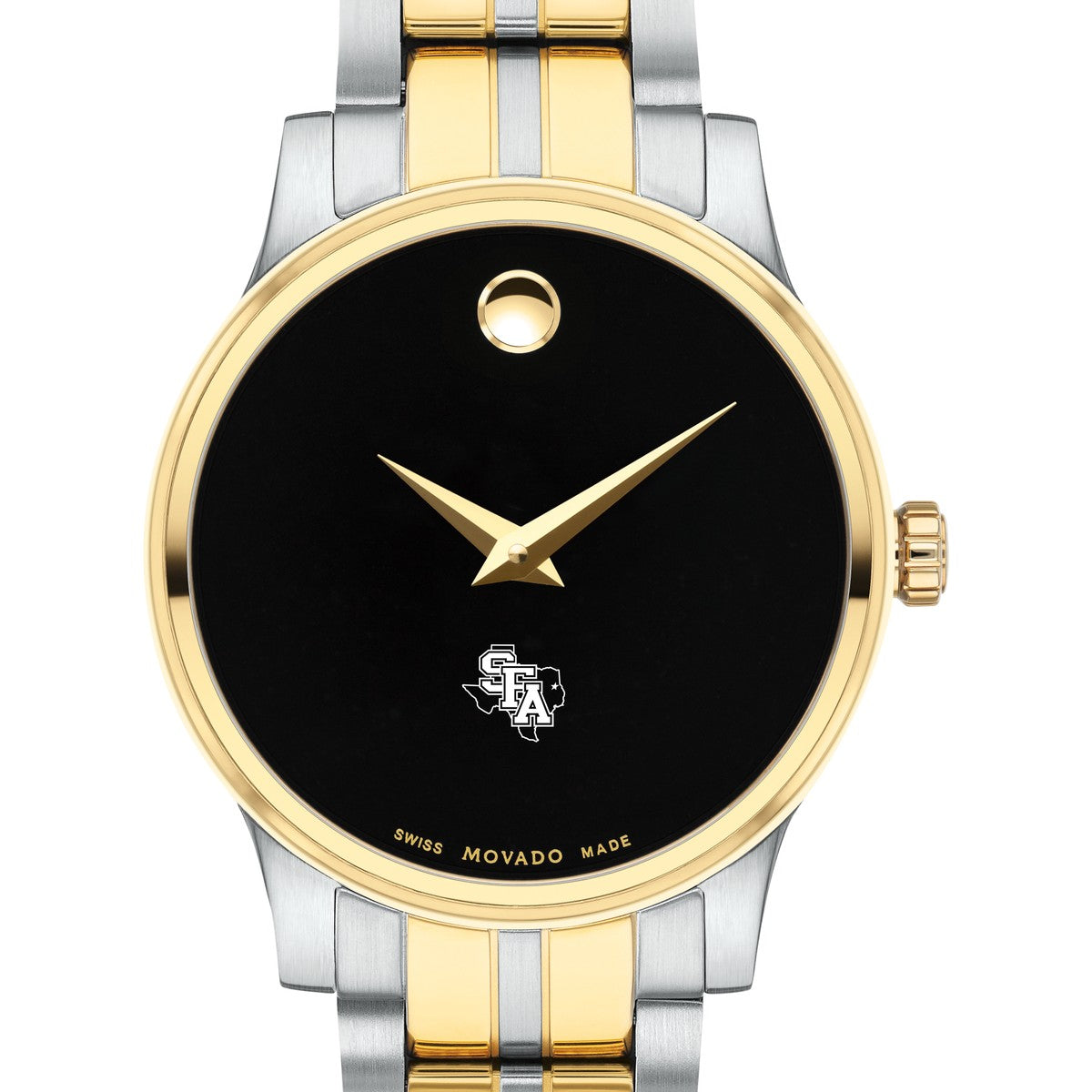 The Stephen F. Austin State University Women's Movado Collection watch showcases the iconic SFASU logo in full color against a sophisticated black dial. This elegant timepiece, featuring the renowned concave dot symbolizing the sun at high noon, embodies timeless style. Personalize your watch with free engraving without any delay to your order.
