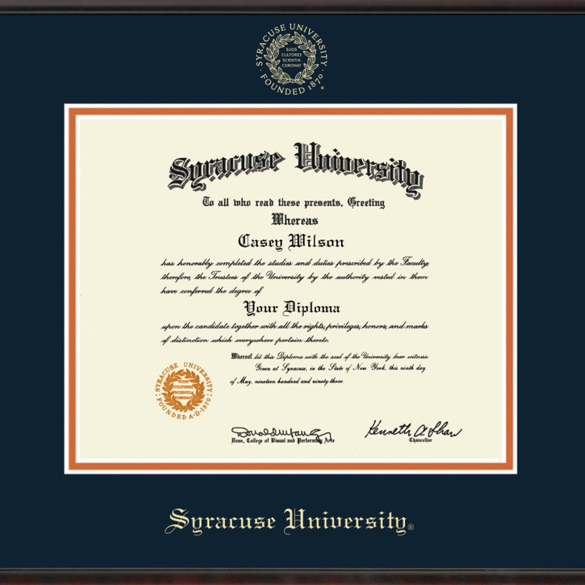 This Syracuse University diploma frame is crafted from solid wood in the USA. Proudly display your Syracuse diploma with museum quality conservation mounting materials to showcase and protect your Syracuse University diploma.