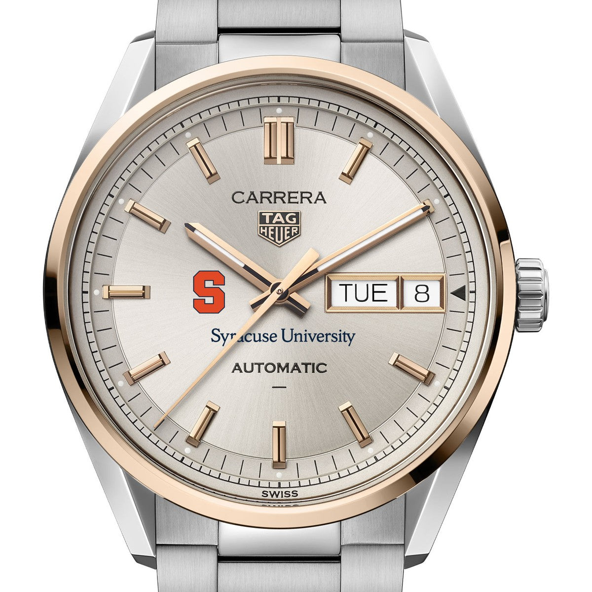 The Syracuse University Men's TAG Heuer Carrera Day-Date Automatic pairs timeless design with modern performance. Featuring a sunray dial with hand-applied 18K 5N rose gold-plated markers and a Day-Date window at 3 o’clock, this elegant timepiece is powered by an advanced automatic movement with an impressive 80-hour power reserve. Complimentary personal engraving.