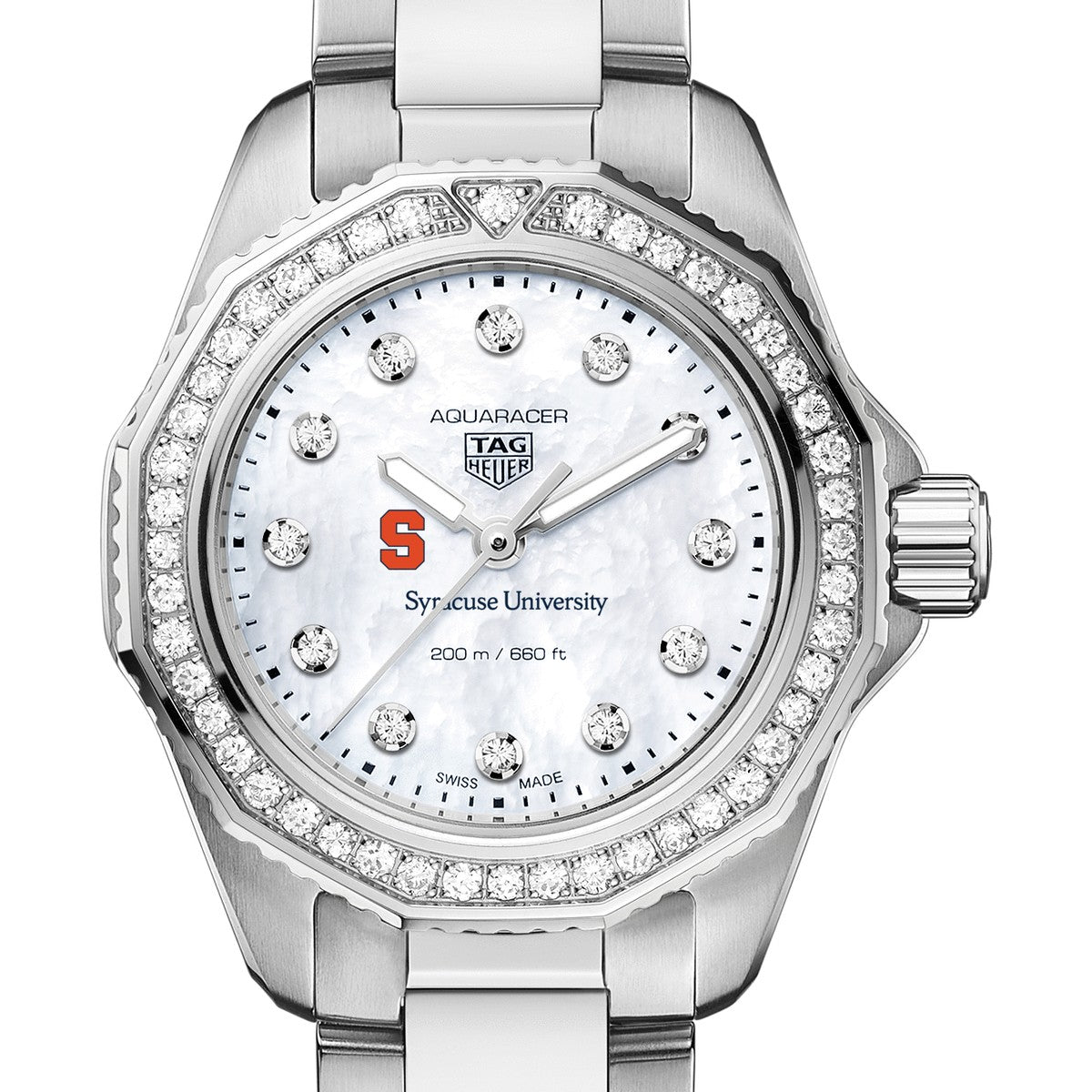 Syracuse University Women's TAG Heuer Steel Aquaracer with Diamond Dial & Bezel features the Syracuse logo. Complimentary personal engraving.