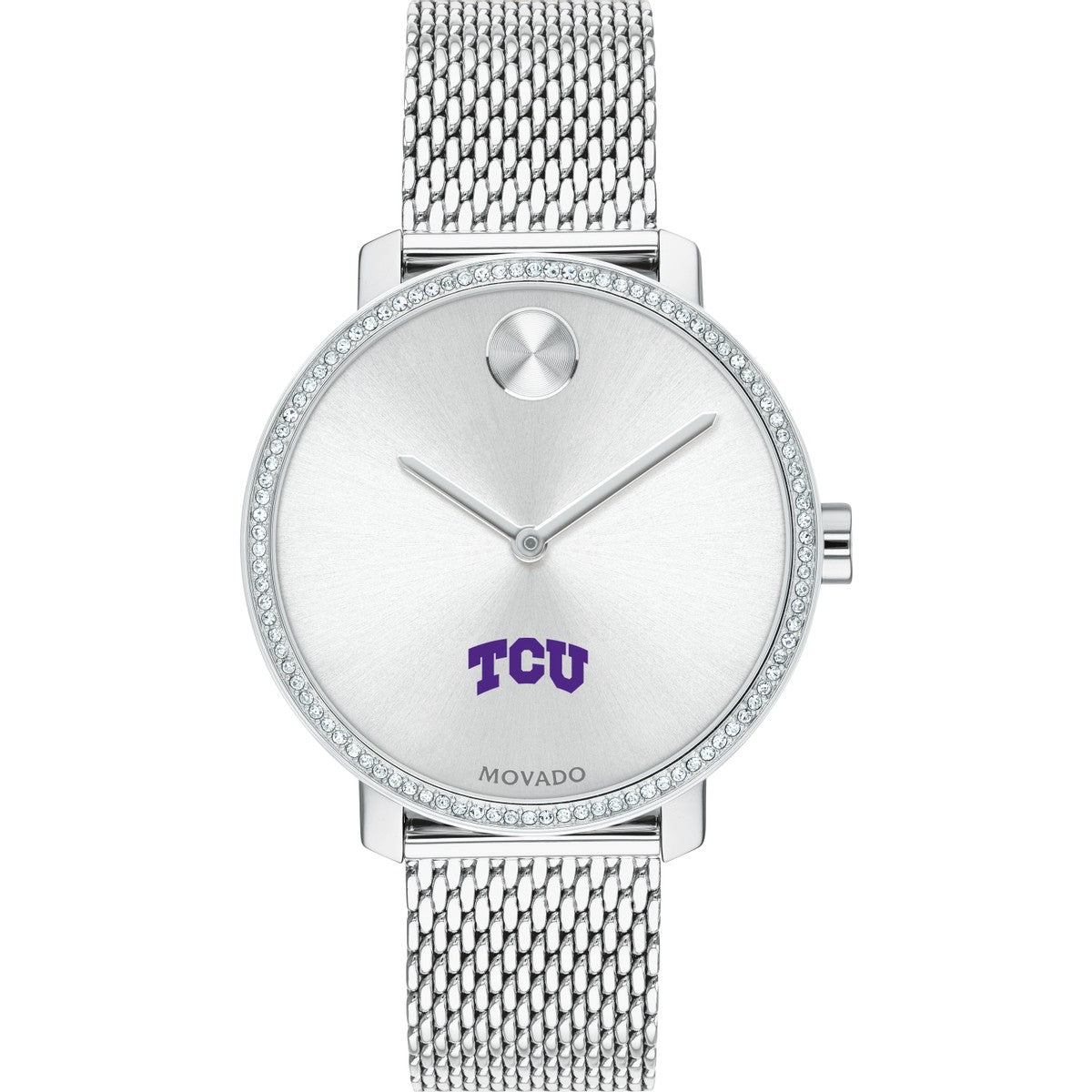 Texas Christian University Women's Movado BOLD watch features the TCU Logo in full color at 6 o'clock on silver sunray dial.