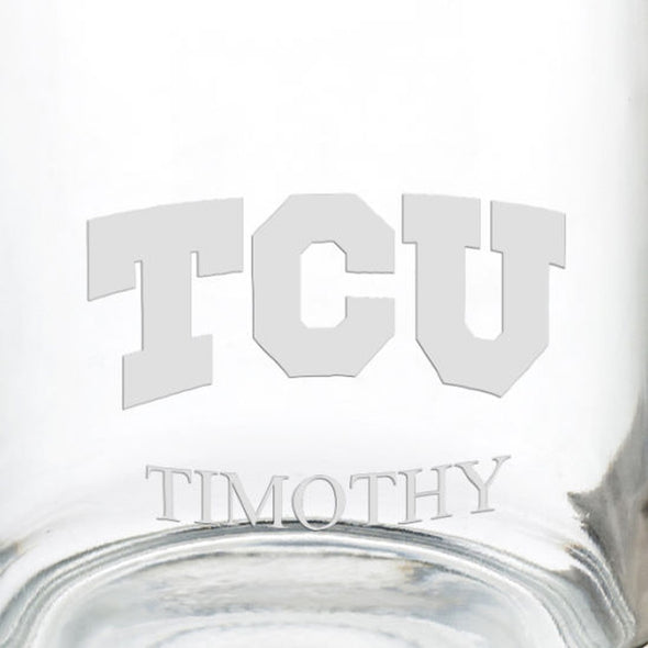 The TCU glass coffee mug is deep-etched with the Texas Christian University logo. Generously proportioned 13 oz glasses are a pleasure to hold. Your name can be added under the logo for free.