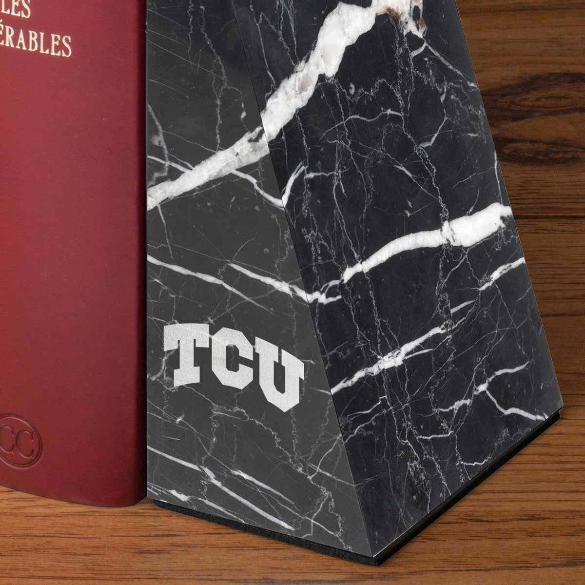 Add another classic to your library collection! Each bookend is crafted from a single piece of solid marble and weighs 4 lbs. Padded to protect furniture and prevent slipping. The Texas Christian University insignia is featured prominently on the front of both bookends.