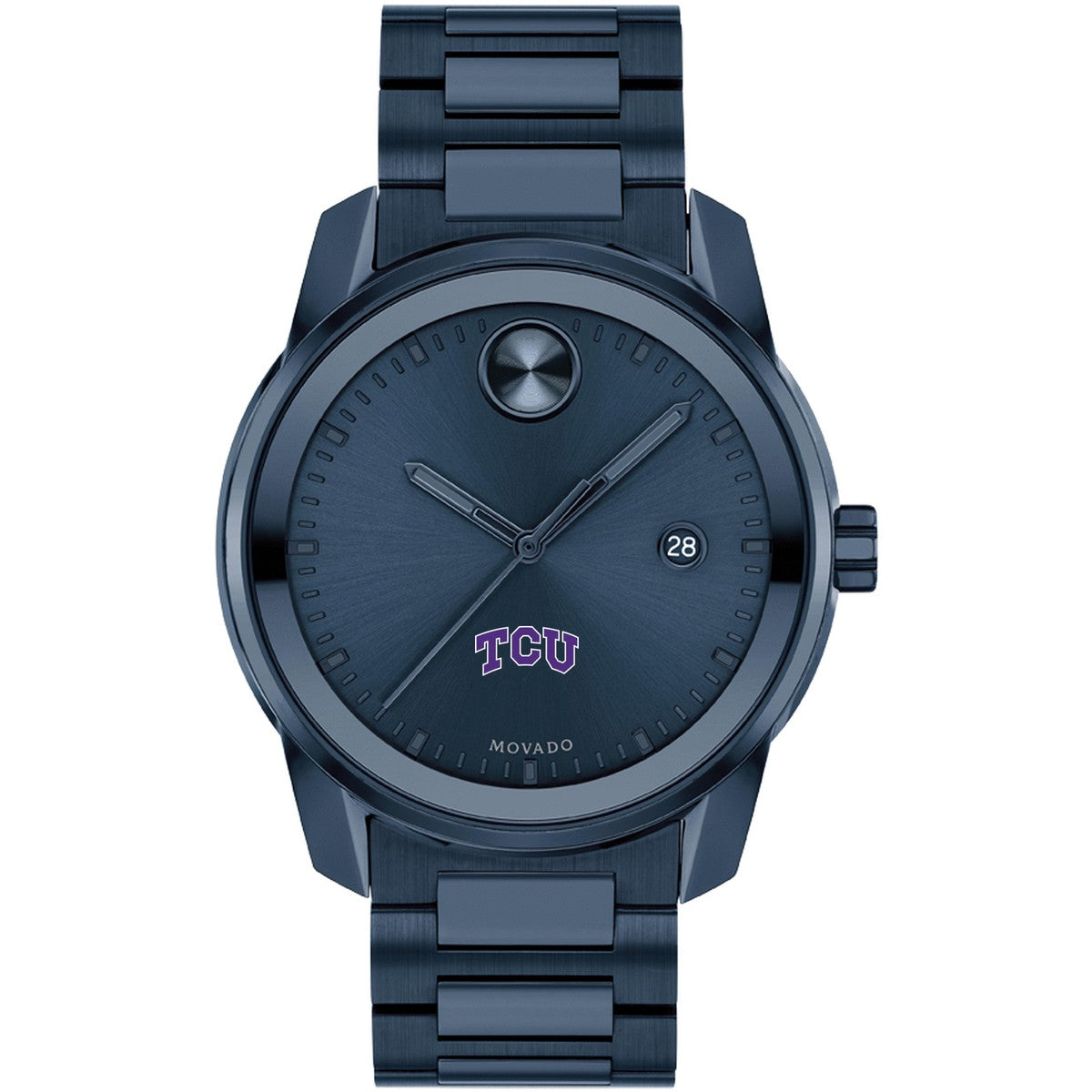 Texas Christian University Men's Movado BOLD Blue Ion with Date Window features high-tech materials, bold signature dot, and the sophistication of Movado with the TCU Logo. Complimentary personal engraving.