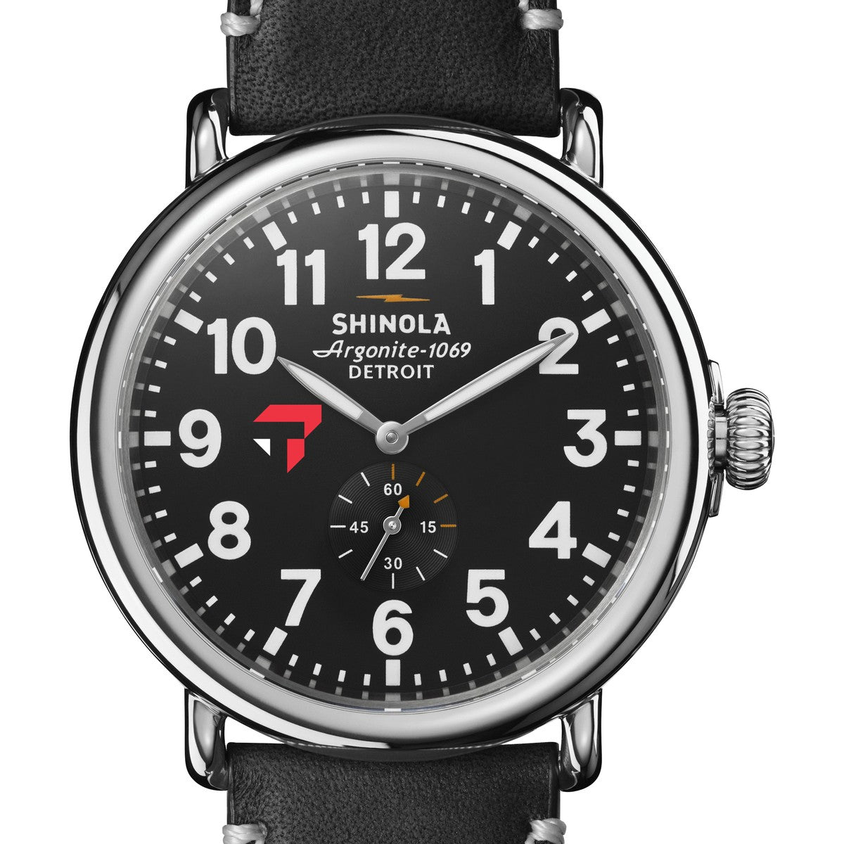 The Shinola Runwell features the Tepper logo in color on the black dial with a large 47 mm case. Every detail of Shinola's flagship timepiece has been engineered with an obsessive focus to ensure it can be worn any way but it can't be worn out. Complimentary personal engraving