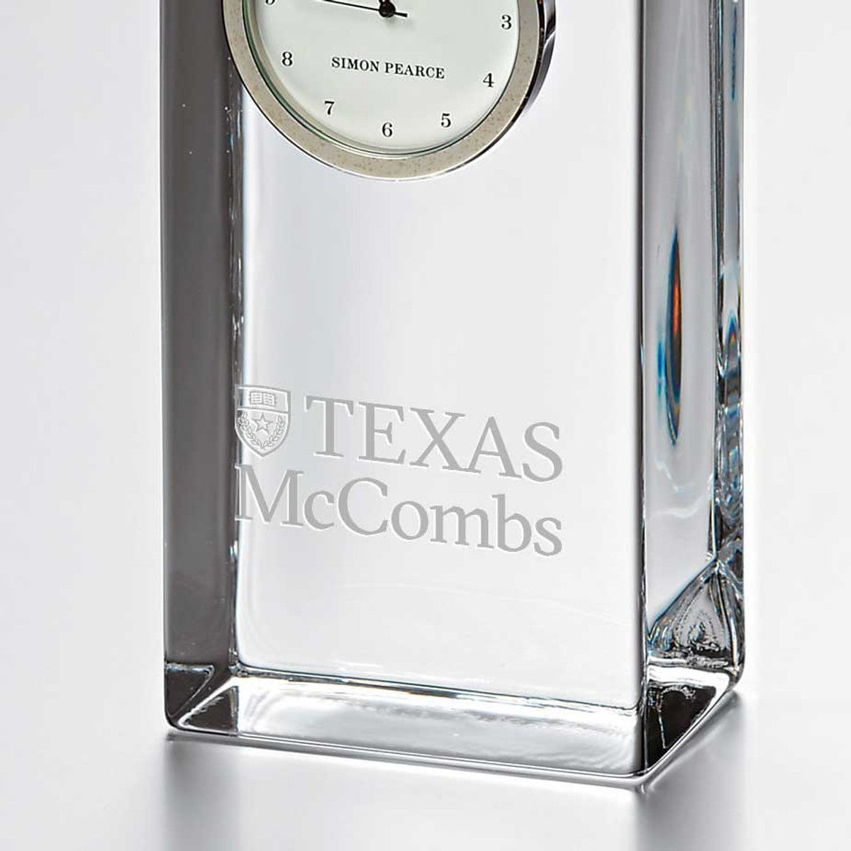 The Texas McCombs Tall Glass Desk Clock stands proudly on any surface, distinctly etched with the Texas McCombs logo. The clock showcases a traditional numbered face with a sweep hand to count the seconds.