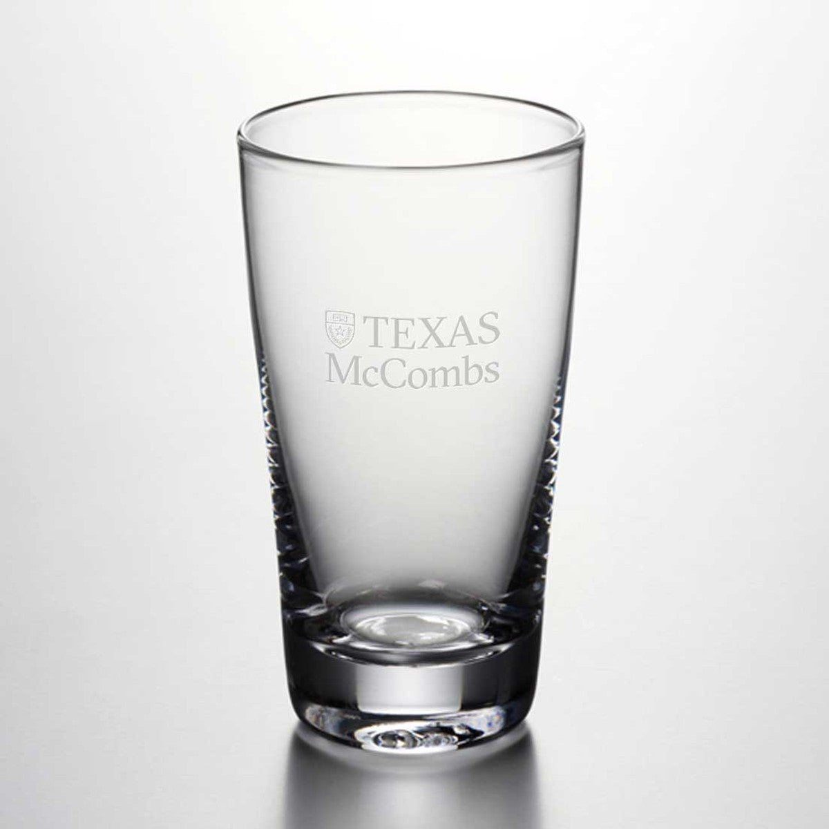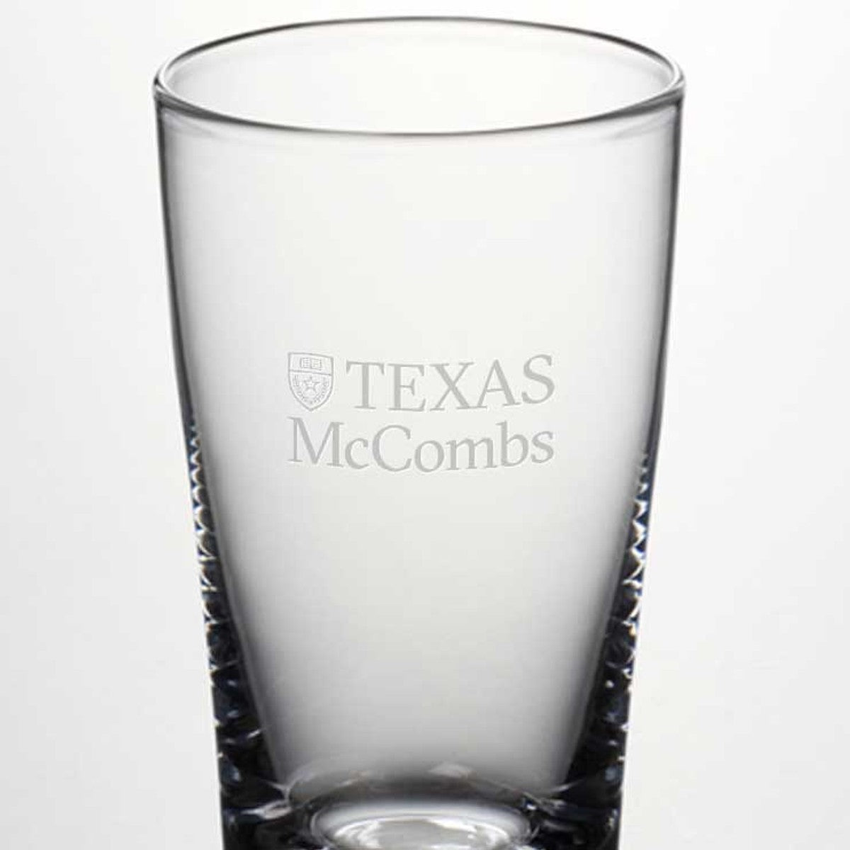 Texas McCombs Pint Glass features the Texas McCombs logo handsomely engraved on the hand-blown glass. From its narrowly flared lip to its sleek, cylindrical body and sturdy, solid base, this pint glass is a classic.