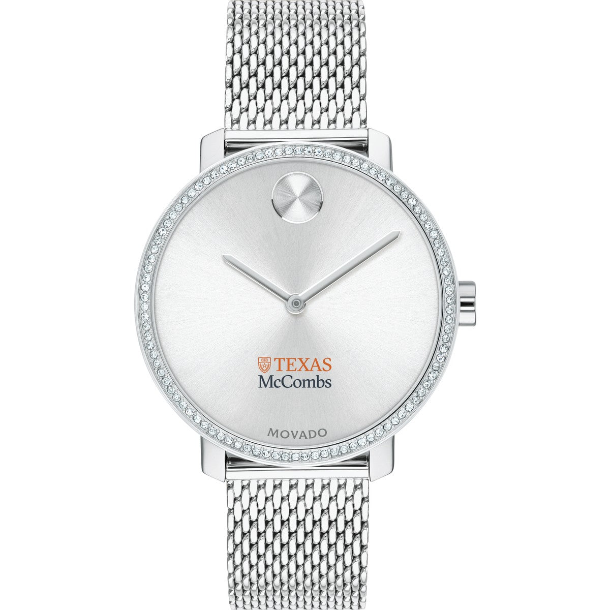McCombs School of Business Women's Movado BOLD watch features the Texas McCombs logo in full color at 6 o'clock on silver sunray dial.