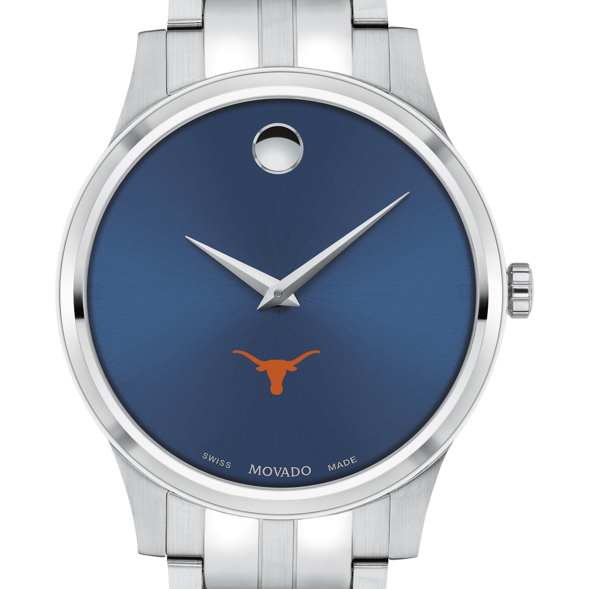 The University of Texas Men's Movado Collection watch boasts a striking blue dial featuring the iconic Texas Logo in full color. This timeless timepiece, renowned for its concave dot representing the sun at high noon, has been a symbol of elegance since its inception in 1947. Make it uniquely yours with free engraving without affecting order processing time.