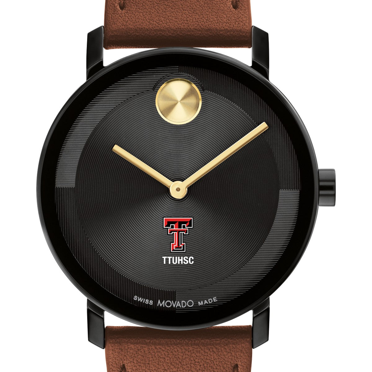 Embrace timeless sophistication with the Texas Tech University Health Sciences Center School of Medicine Men's Movado watch, featuring TTUHSC SOM logo on the dial. Crafted with a luxurious Cognac Nappa leather strap and a striking micro-textured black tonal dial with a glossy lacquer overlay. Complimentary personal engraving.