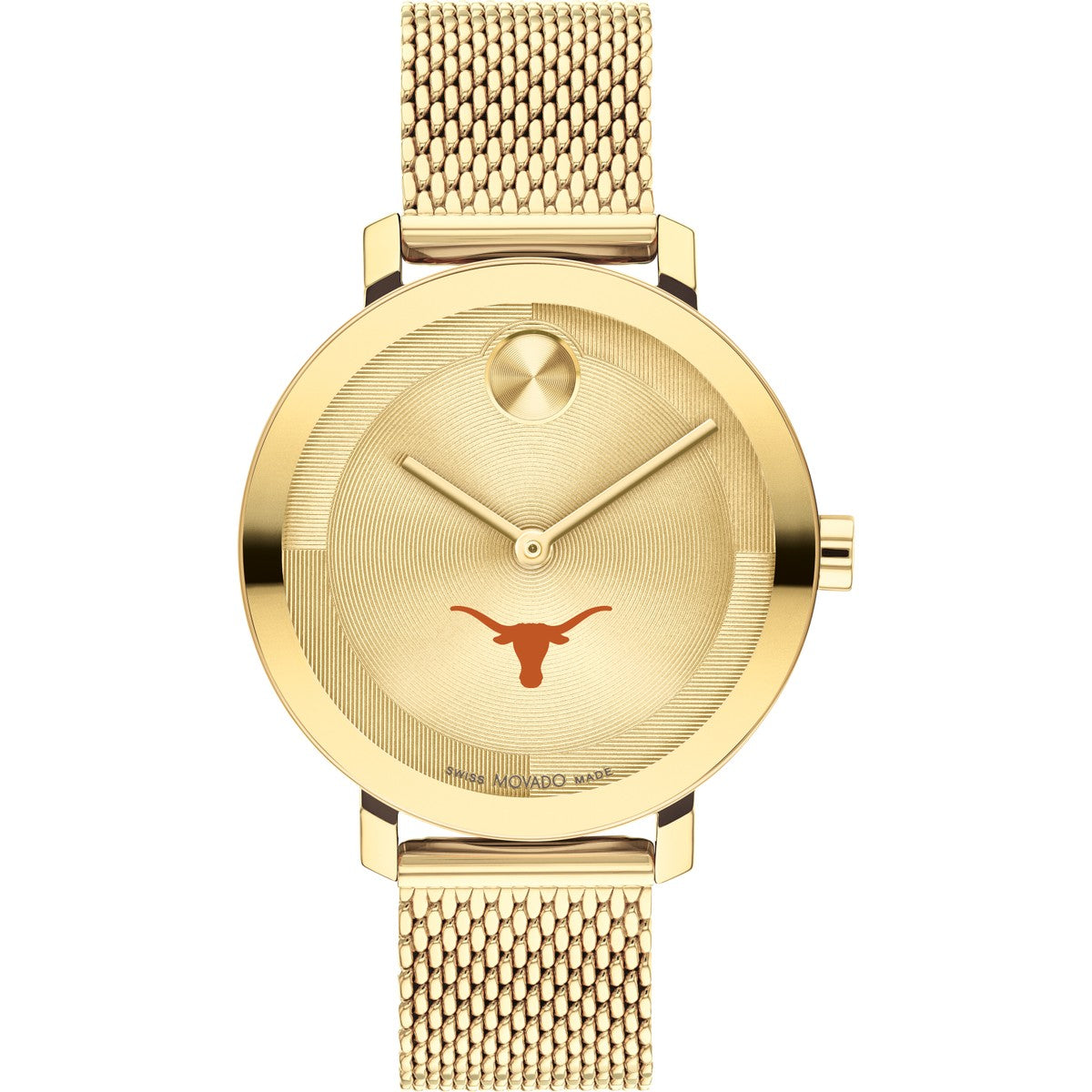 The University of Texas Women's BOLD Movado features the prestigious Texas Logo. Its pale gold Ionic-plated stainless steel mesh bracelet exudes contemporary elegance, making it a timeless accessory for the modern woman.