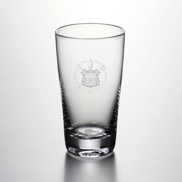 Trinity Pint Glass features the Trinity logo handsomely engraved on the hand-blown glass. From its narrowly flared lip to its sleek, cylindrical body and sturdy, solid base, this pint glass is a classic.