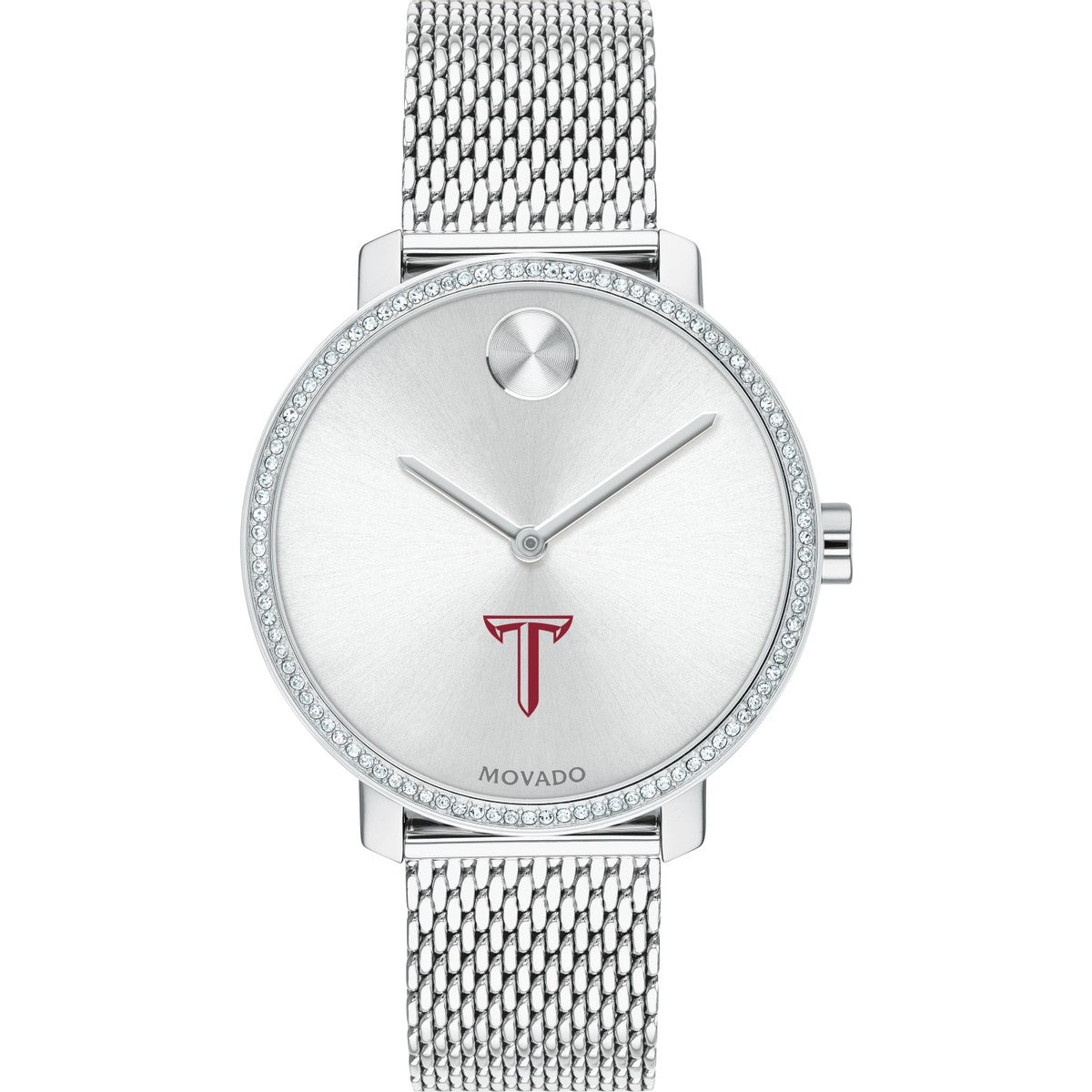 Troy University Women's Movado BOLD watch features the Troy Logo in full color at 6 o'clock on silver sunray dial.