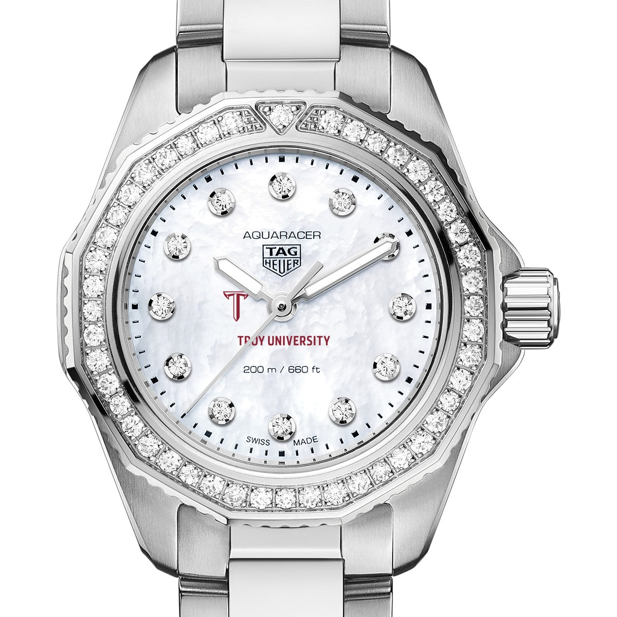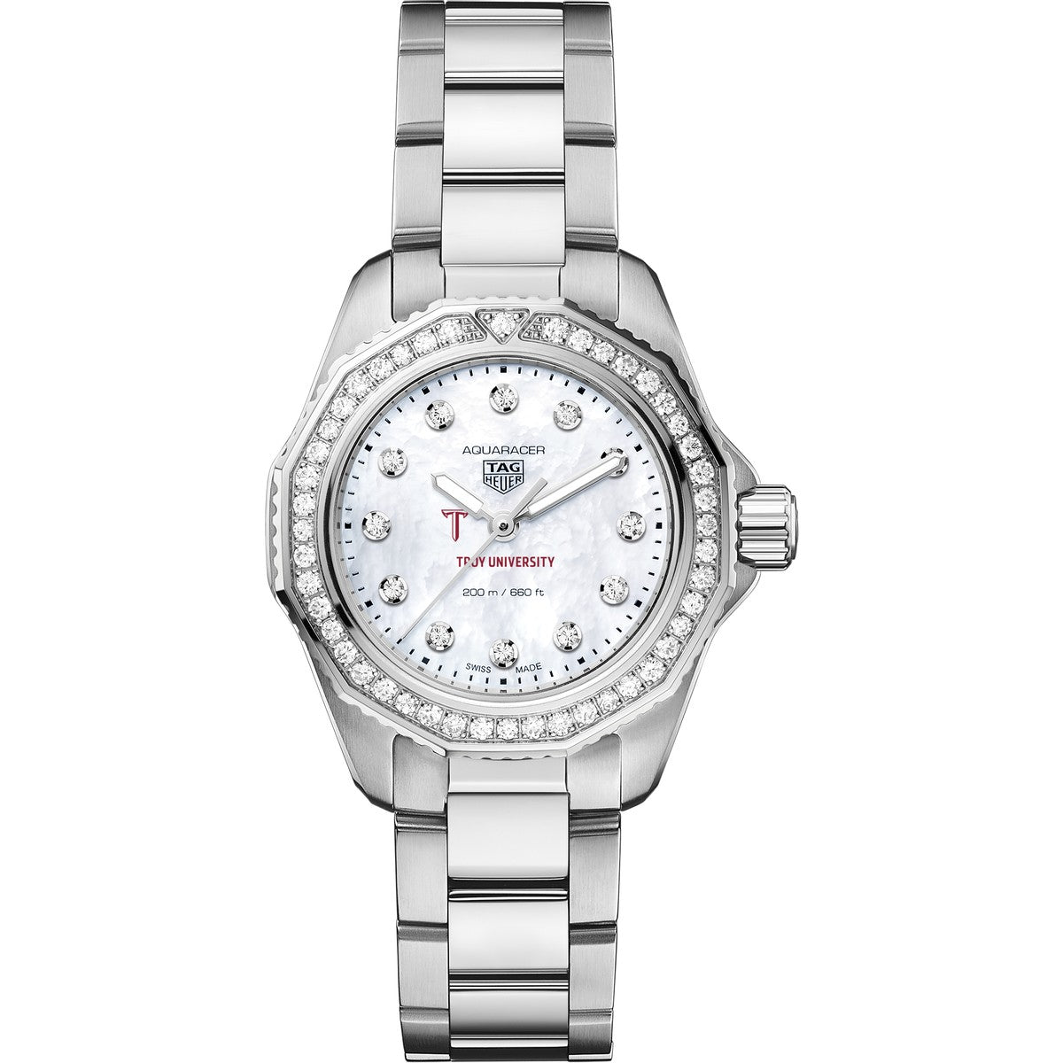 Troy University Women's TAG Heuer Steel Aquaracer with Diamond Dial & Bezel features the Troy Logo. Complimentary personal engraving.